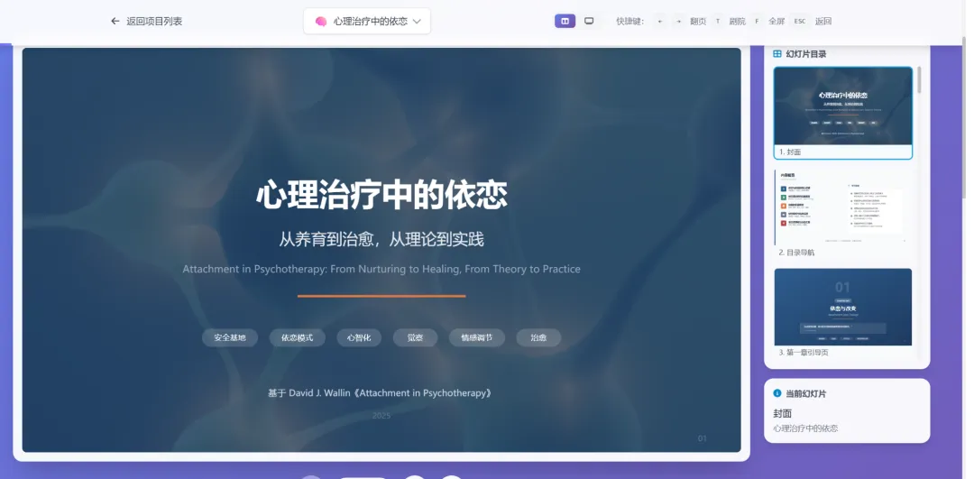 - 逻辑框架生成:用户输入主题(如“肺癌早期筛查研究进展”),AI自动生成包含封面、目录、核心章节的PPT大纲。