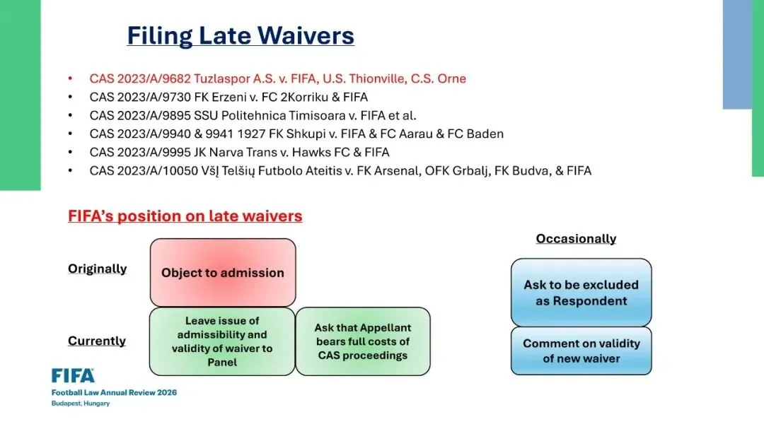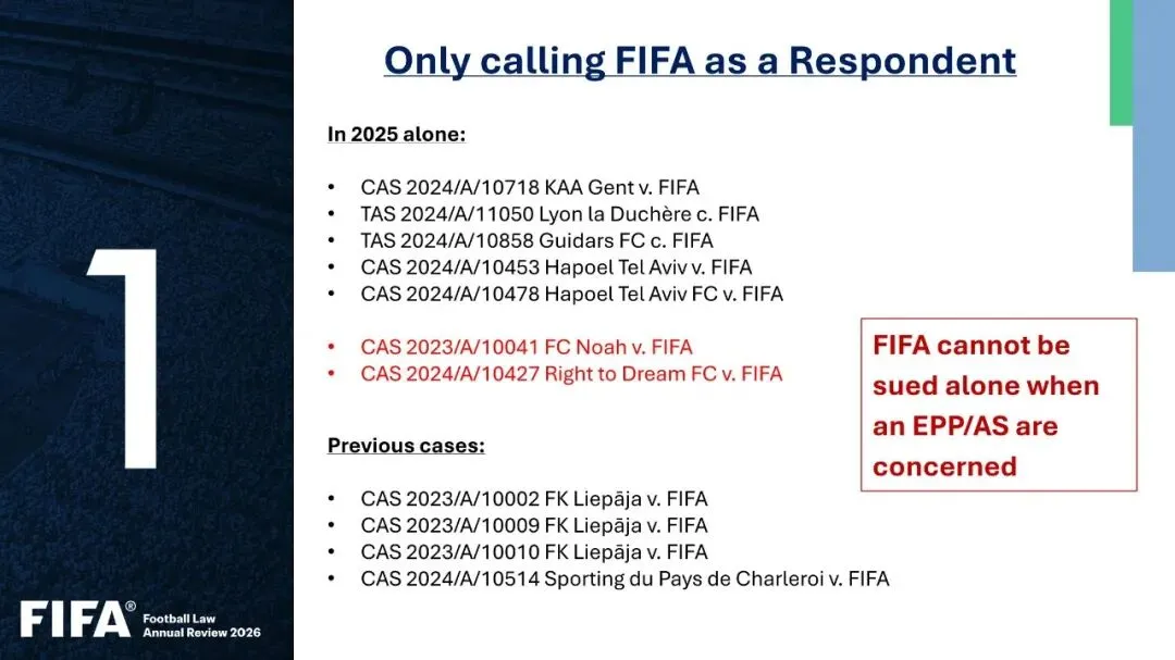 •CAS 2024/A/10718 — 根特足球协会 诉 国际足联•TAS 2024/A/11050 — 里昂拉迪谢尔 诉 国际足联•TAS 2024/A/10858 — Guidars FC 诉 国际足联•CAS 2024/A/10453 — 海法工人足球俱乐部 诉 国际足联•CAS 2024/A/10478 — 海法工人足球俱乐部 诉 国际足联•CAS 2023/A/10041 — FC诺亚 诉 国际足联•CAS 2024/A/10427 — 追梦足球俱乐部 诉 国际足联此前已确立的判例同样明确: