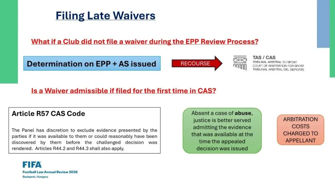 若俱乐部未在EPP审查程序期间提交弃权声明,在EPP审查结果及相关处分作出后,是否可以在CAS程序中首次提交弃权声明?