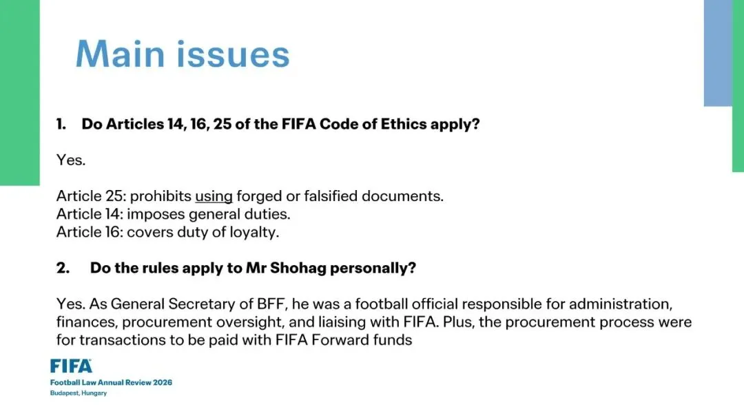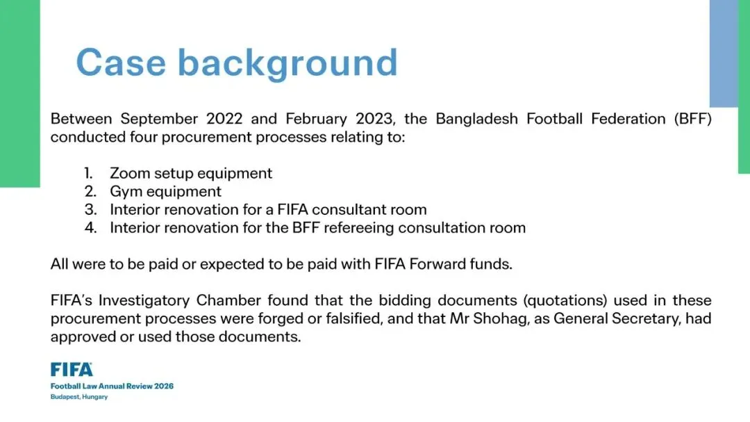 具有约束力。 作为孟加拉国足球联合会秘书长,Shohag先生是负责行政管理、财务、采购监督及与国际足联联络的足球官员。此外,涉案采购系以国际足联Forward发展计划资金支付的交易项目。