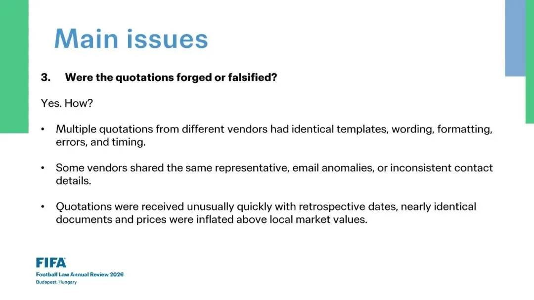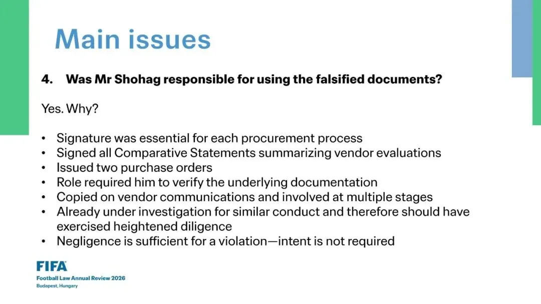 国际足联调查庭查明,上述采购程序所使用的招标文件(报价单)系伪造或篡改,且Shohag先生作为秘书长,审批并使用了上述文件。