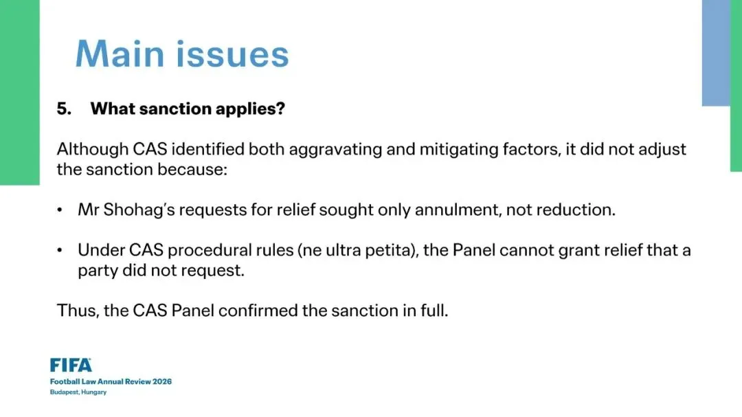 •Shohag先生的上诉请求仅寻求撤销处罚,而非减轻处罚;•依据CAS程序规则中的不得超越诉求原则(ne ultra petita),仲裁庭不得超出当事方的诉求范围作出裁决。✅ CAS仲裁庭最终全面确认原处罚决定。