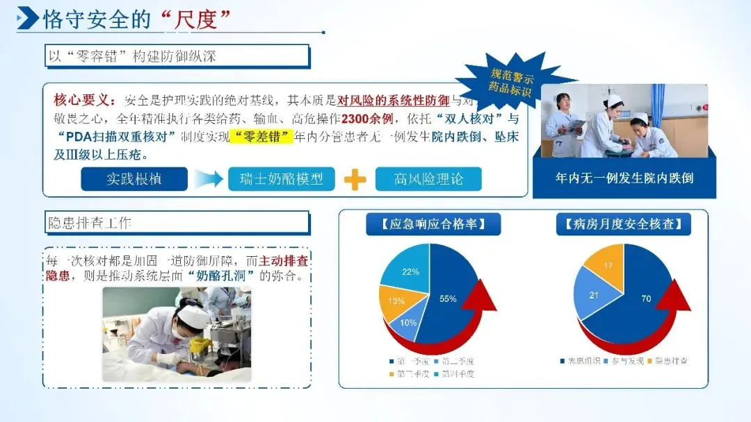 本板块为全年工作的底线核心,以系统性风险防御为核心要义,依托瑞士奶酪模型等理论搭建安全管理体系。全年精准完成各类高危操作 2300 余例,通过双人核对与 PDA 扫描双重核对制度实现操作零差错;常态化开展隐患排查与月度安全核查,年内分管患者无一例发生院内跌倒、坠床及 Ⅲ 级以上压疮,全面守住护理安全防线。
