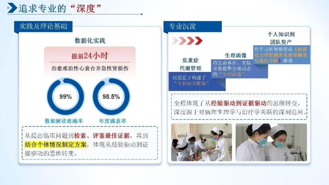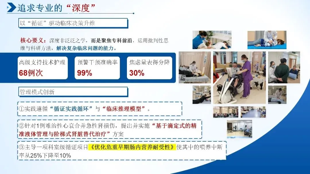 本板块为全年工作的核心引擎,聚焦专科前沿与复杂临床问题,以循证实践循环为核心方法。全年完成高级支持技术护理 68 例次,预警干预准确率达 99%;主导科室级循证护理项目,显著优化危重患者肠内营养喂养中断率;成功攻克难治性心衰合并急性肾损伤等复杂病例,同时沉淀专科知识体系,完成从经验驱动到证据驱动的临床思维转变。