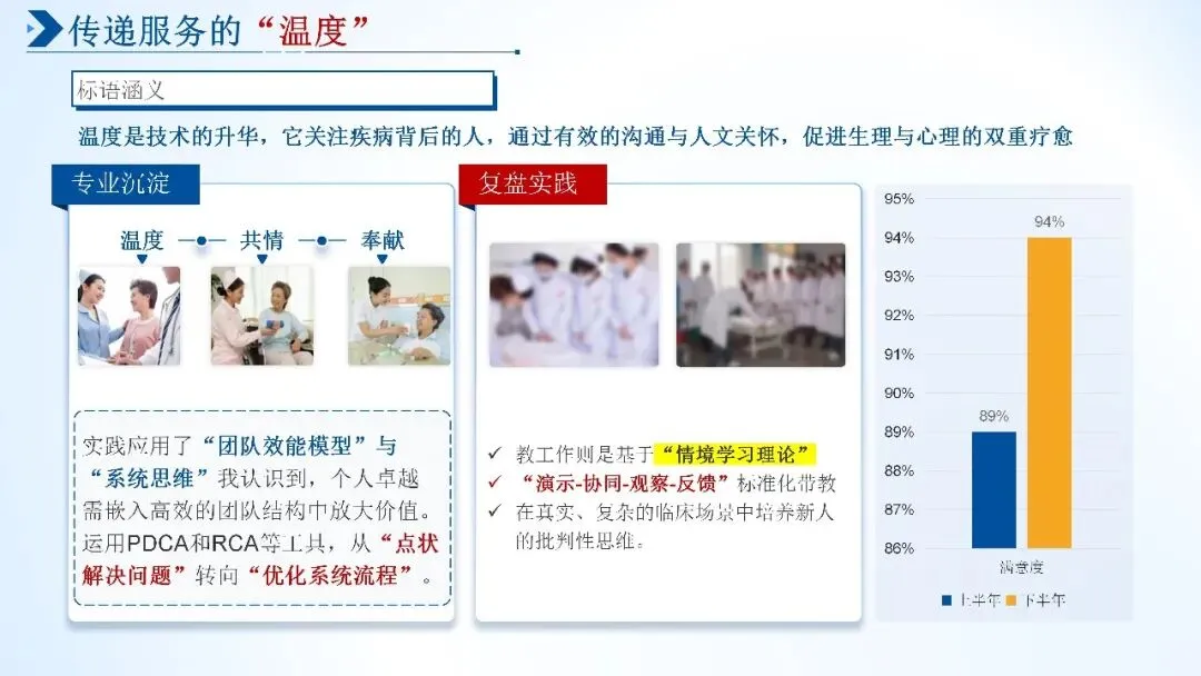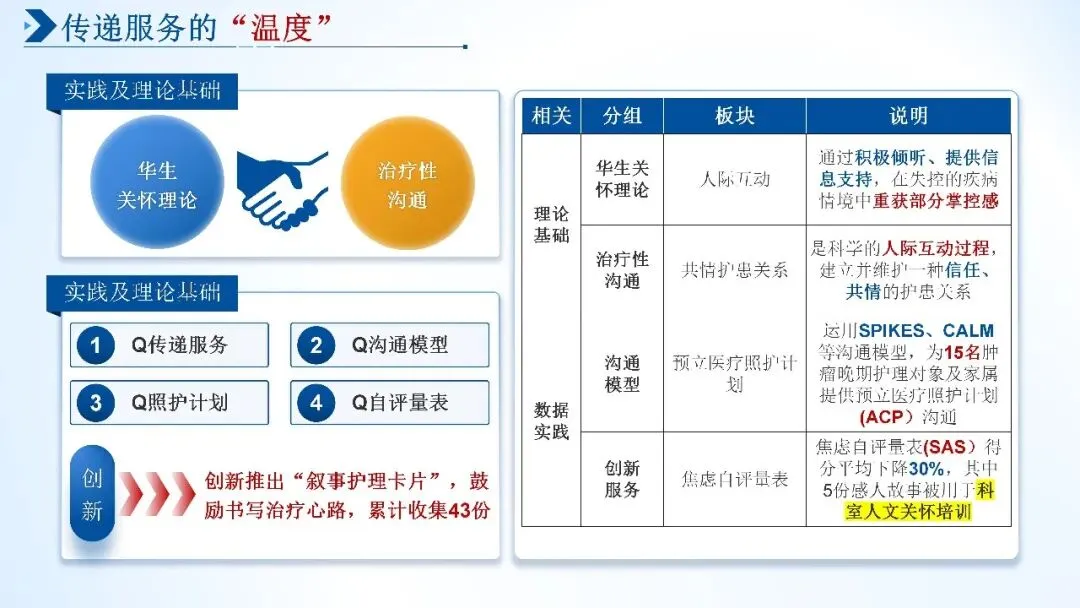 本板块为护理服务的内核升华,以华生关怀理论、治疗性沟通为理论支撑,聚焦患者心理与情感需求。创新推出 “叙事护理卡片” 服务,累计收集患者治疗心路 43 份;运用专业沟通模型,为 15 名肿瘤晚期患者及家属提供预立医疗照护计划沟通;有效降低患者焦虑水平,推动科室患者满意度从上半年 89% 提升至下半年 94%,实现生理治疗与心理疗愈的双向赋能。