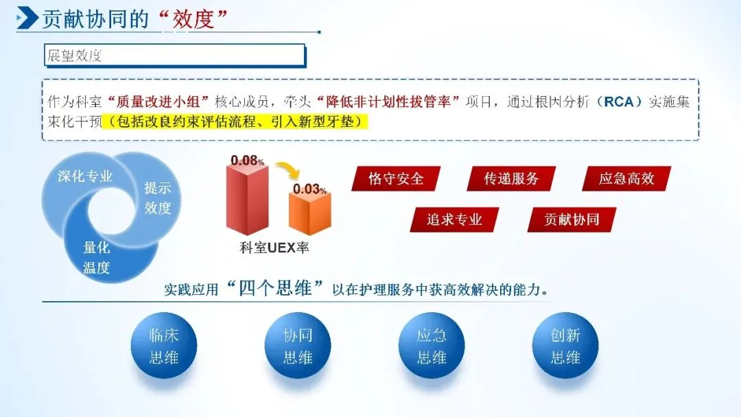 本板块为工作价值的延伸与落地,核心是通过流程优化、人才带教、质量改进,实现个体价值在团队中的最大化。作为科室质量改进小组核心成员,牵头完成 “降低非计划性拔管率” 专项改进项目,推动科室 UEX 率显著下降;基于情境学习理论搭建 “演示 - 协同 - 观察 - 反馈” 标准化带教体系,培养新人临床思维;同时锚定重症康复深耕、服务量化管理、护理价值可视化等方向,明确了后续工作的提升路径。