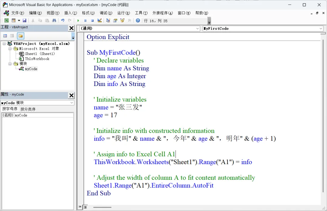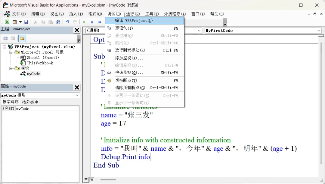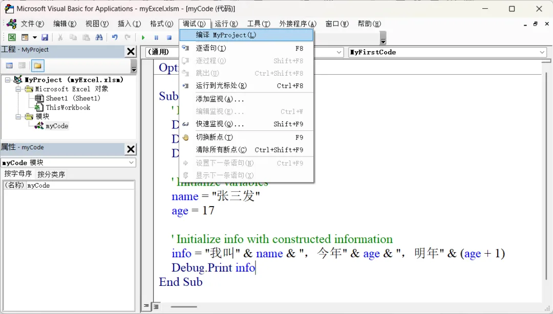 - 调试:如果执行时发生错误,需要查看代码哪里出了问题,发现问题并加以改正。调试是一个很重要的步骤,也是非常困难的步骤。VBE 也提供了很多手段和工具,帮助我们定位错误。