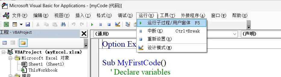 从 VBA 简介(六)开始,我们正式进入了代码窗口,开始写称为子程序(SUBroutine)的程序。“子程序”这个概念来自更古老的 Fortran 语言,在 BASIC 中称为“过程”,以区别于“函数”(Function)。我们以后会讲到过程和函数的区别,现在只需要明白我们在代码窗口中写的所有代码都必须包含在 Sub ... End Sub 结构(或 Function ... End Function 的结构)中。假设我们已经写好了一个称之为 MyFirstCode 的过程(如图1),那如何运行这个过程呢?一种方法是在 Excel 界面,点击“开发工具”,在开发工具功能区中,点击“宏”,如图2:鼠标放在“宏”按钮上,会显示一个小的帮助窗口,说明这个按钮的作用。点击这个按钮,或使用快捷键 Alt + F8,会显示宏列表,如图3:在宏列表中,选择要运行的宏,点击右侧的“执行”按钮,即可运行所选择的宏。也可以单步执行,可以观察每一步的运行情况,这点我们以后再详细讲。第二种方法是打开 VBE,如图1。按 F5 可以运行当前代码。如果鼠标不在 Sub ... End Sub 结构体内,则会弹出一个窗口,让你选择要运行的宏,如图4:图4 与图3 类似,都是供你选择要运行的宏。选择以后,点击“运行”即可。第三种方法,也是在 VBE 中,点击“工具” => “宏……”,也会弹出图4 的对话框,此处就不啰嗦了。Excel VBA 在这里有些混乱。点击 VBE 主菜单栏上的“运行”,下拉菜单的第一行是“运行子过程/用户窗体”,如图5:Excel 为了与以前的版本兼容,“宏”这个概念一直保留了下来,现在的“宏”就体现为 VBA 的 Sub。所以,你可以将宏与 Sub 理解为一个东西。点击“运行” => “运行子过程/用户窗体”的快捷键就是 F5。F5 的作用我们前面已经提过,此不赘述。用户窗体我们以后会详细介绍。我们可以在运行代码之前,先对代码进行编译。点击 VBE 主菜单栏上的“调试”,下拉菜单中的第一项是“编译 VBAProject”,如图6:我们曾经说过,Excel 的每个工作簿都有一个 VBA 工程项目,名为 VBAProject,这个名字可以修改。譬如改为 MyProject,那么图6 上的菜单也将改为“编译 MyProject”,如图7:我们在 Excel 中用 VBA 编程,简单来说包括这样几个步骤:- 代码编辑:简单说就是写代码,将我们完成任务的思路体现为一行行代码。