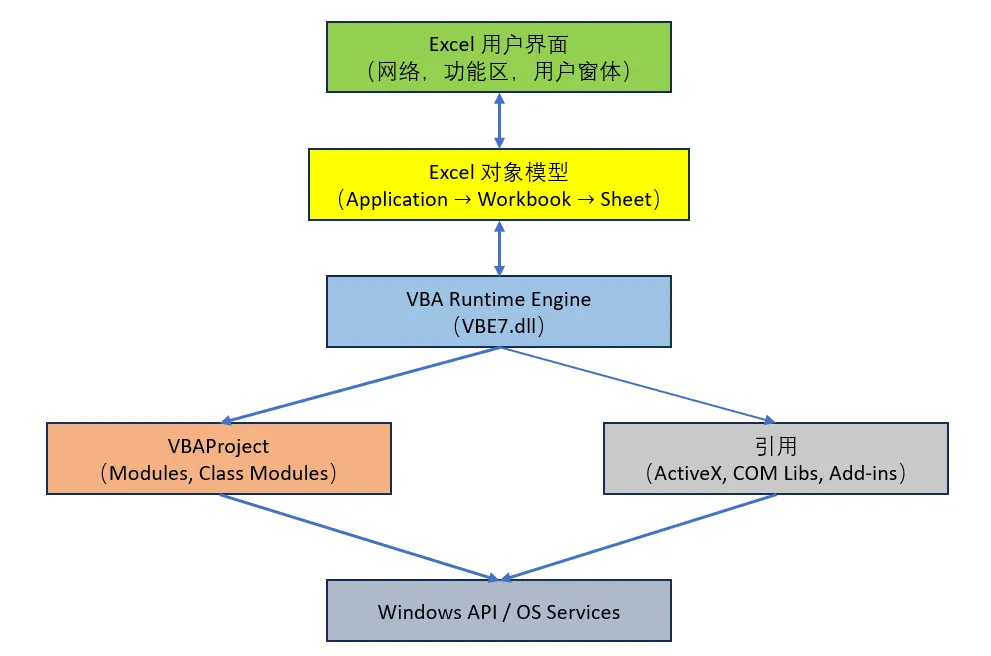 需要强调的是,与其前辈 BASIC、Visual Basic(VB)不同,VBA 是“寄生”(hosted)在 Excel 中的。Excel 包含了 VBA 的编辑器、编译器、运行时系统。VBA 不能单独存在,也不能编译为独立运行的 .exe 程序。Windows 平台的桌面版 Excel 是功能最齐全、最强大的 VBA 宿主环境,其架构如图8:从这个架构图可以看出,VBA 不仅可以在模块中写代码,也可以在类模块中写各种 Class,不仅可以访问 Excel 的各种对象,也可以通过引用访问其他的 COM 组件和 Excel 加载项,还可以访问 Windows 的 API,以获取操作系统提供的服务。随着我们对 VBA 了解的逐步深入,这些内容都会逐步涉及到。至此,我们对 VBA 的了解应该说已经入门,下面就是要“探其堂奥”了。