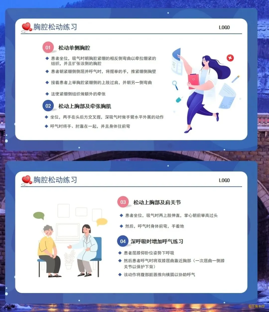 胸腔松动练习配合深呼吸进行躯干和上肢主动活动,可以维持或改善胸壁、躯体及关节的活动度,增强吸气深度或呼气控制。