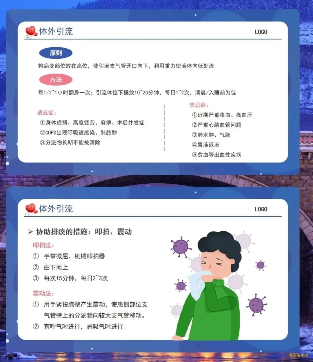 促进肺部清洁技术方面,体位引流是将病变部位放在高位,使引流支气管开口向下,利用重力使液体向低处流。每半小时到一小时翻身一次,引流体位下摆放10-20分钟,每日1-2次,清晨或入睡前为佳。叩拍法用手掌微屈或机械叩拍器由下而上叩拍,每次15分钟,每日2-3次。震动法则是在呼气时用手紧按胸壁产生震动,使分泌物向较大支气管移动。