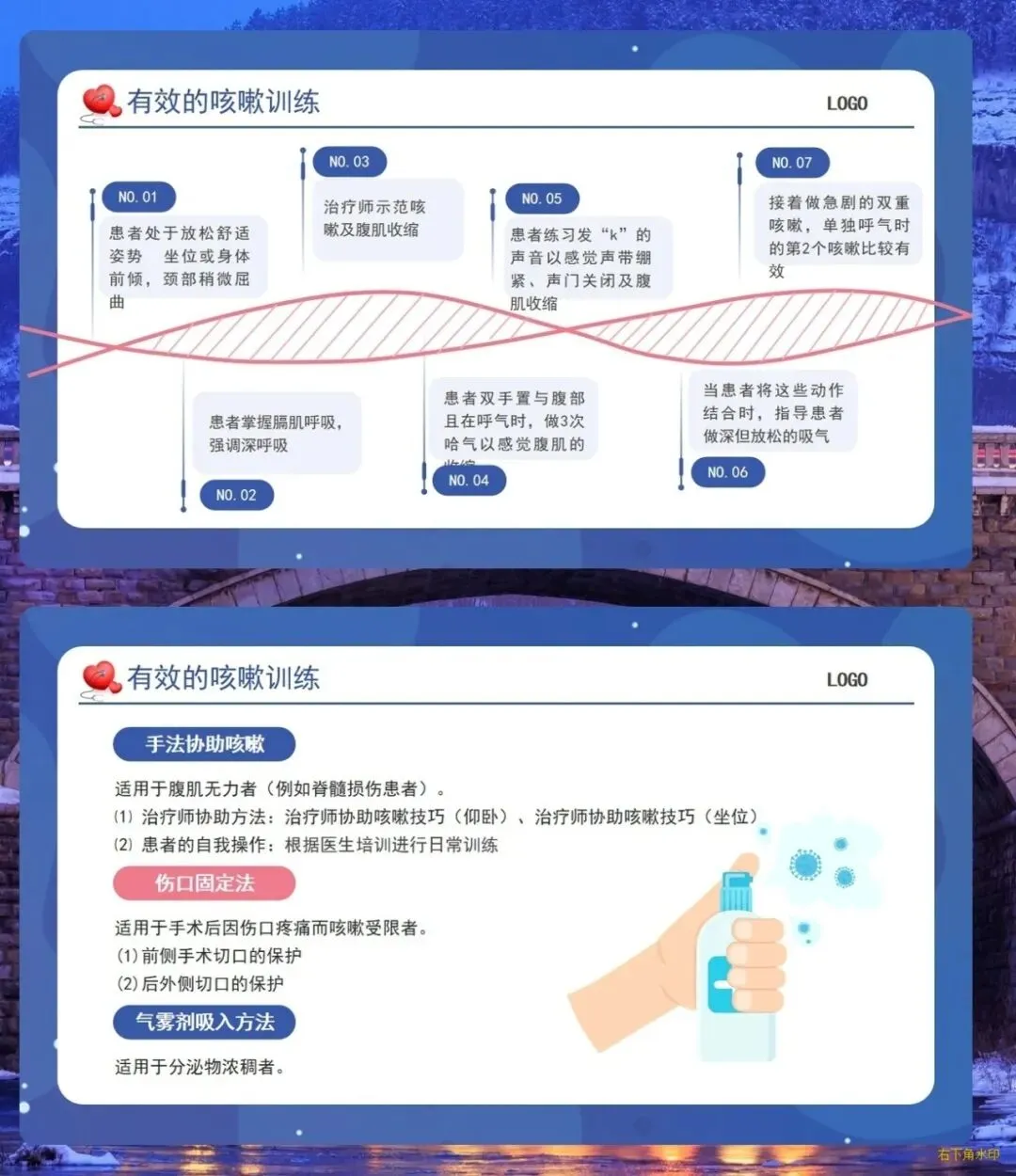 有效的咳嗽训练对于清除呼吸道分泌物至关重要。对于腹肌无力者,我们可以采用手法协助咳嗽。手术后患者要教会伤口固定法,减轻疼痛,促进有效咳嗽。主动循环呼吸技术包括呼吸控制、胸廓扩张运动和用力呼气技术,可以有效清除支气管分泌物。