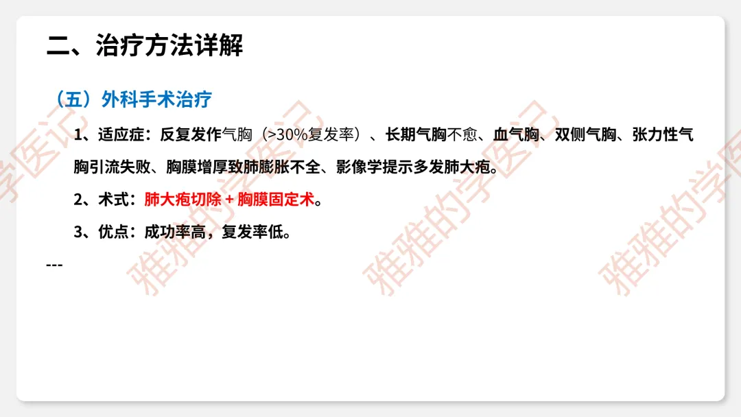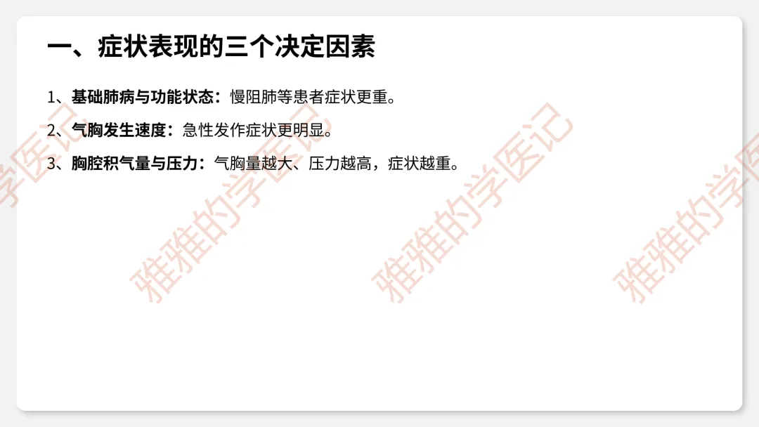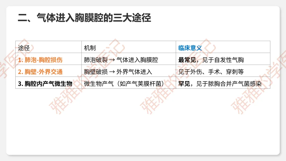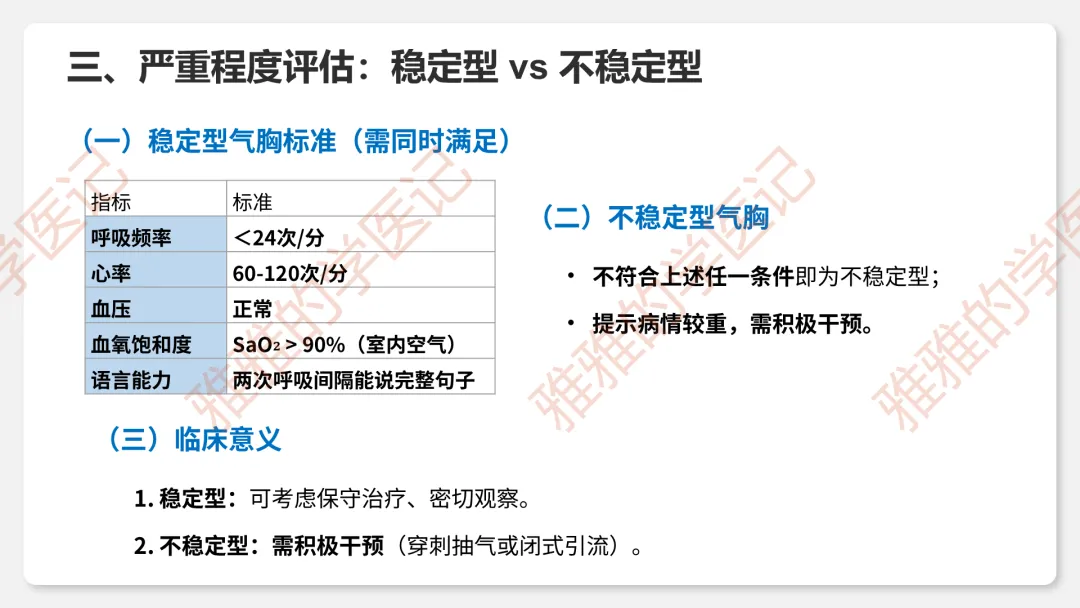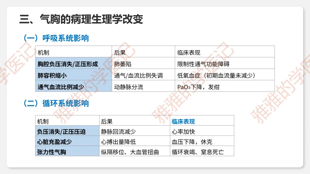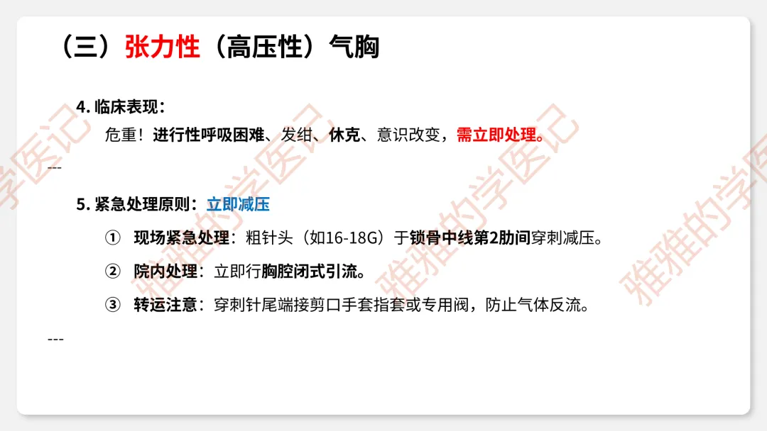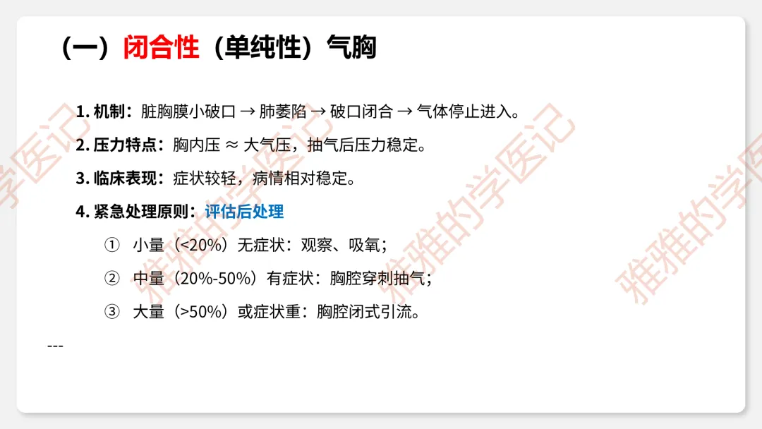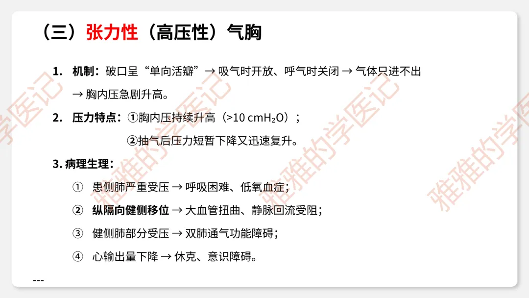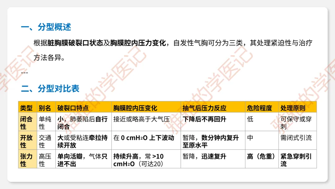 2、临床类型:闭合性(破口闭合)、开放性(持续交通)、张力性(单向活瓣)——重点掌握压力变化和危害。