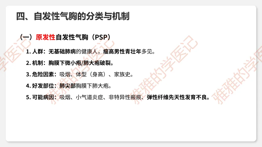1、病因分类:原发性(肺大疱)、继发性(COPD、结核等)、特殊类型(月经性、妊娠期)。