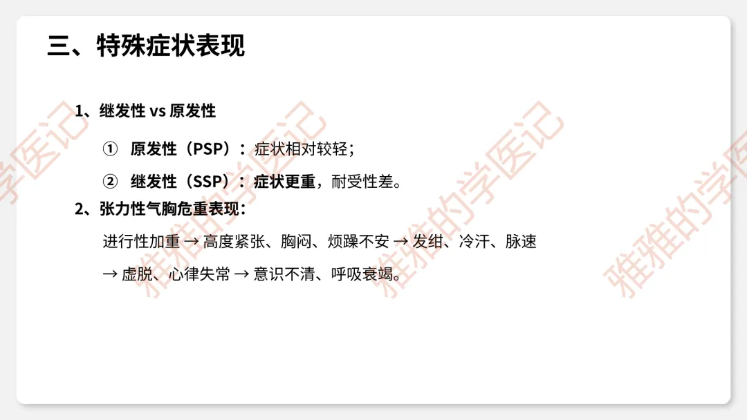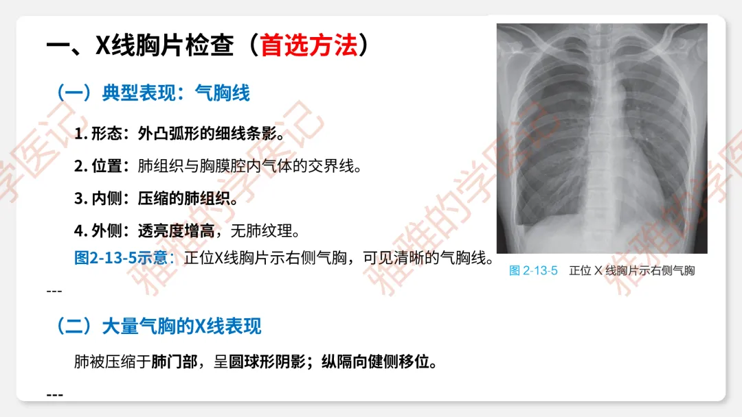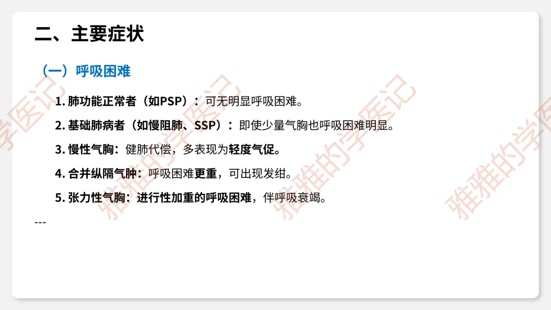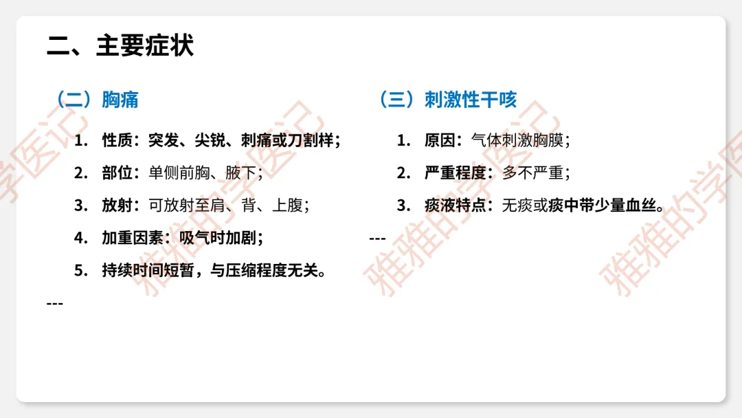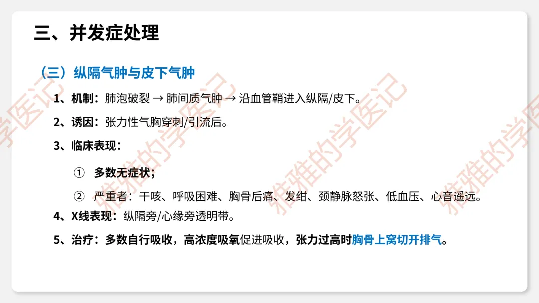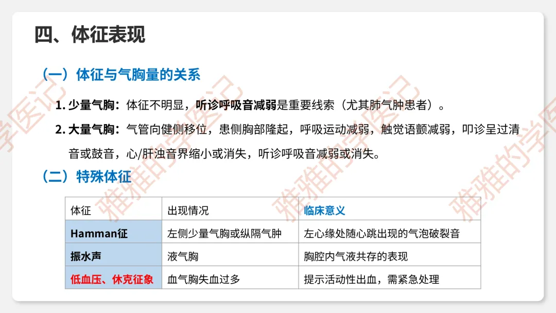 3、临床表现:症状(突发胸痛、呼吸困难)、体征(叩诊鼓音、呼吸音消失、Hamman征)。