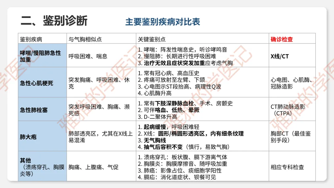 5、诊断与鉴别:与哮喘、心梗、肺栓塞、肺大疱等鉴别。