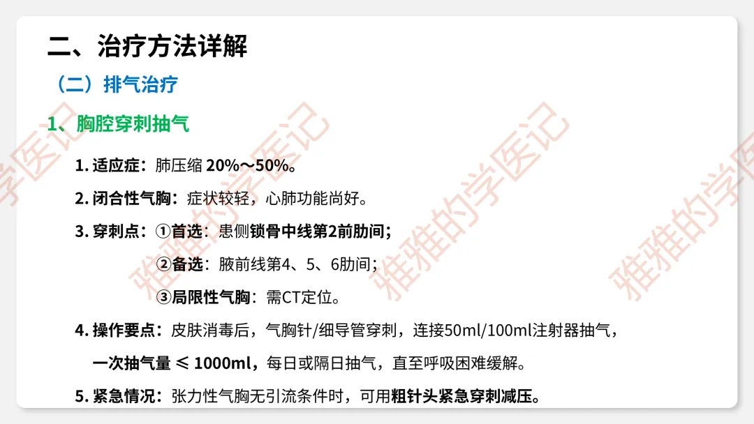 4、影像学:X线气胸线、肺压缩估算(侧胸壁至肺边缘距离≥2cm为大量)、CT鉴别肺大疱。