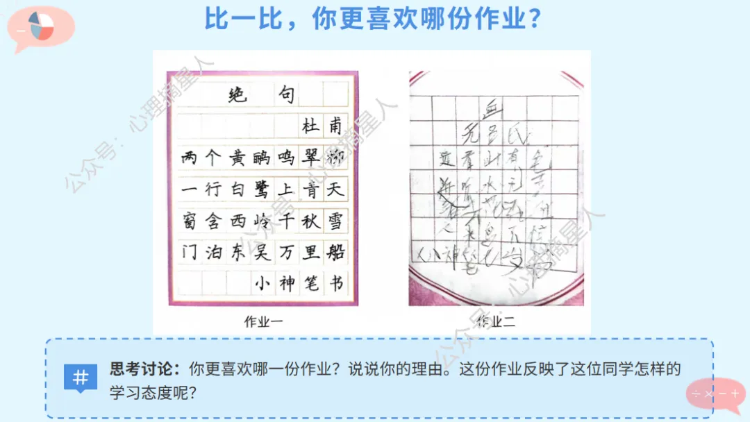 用两份不同的作业图片作为导入,让学生对两份作业做出判断,感受两位同学对待作业不同的态度和行为,同时引导学生进行讨论,导出本课主题。