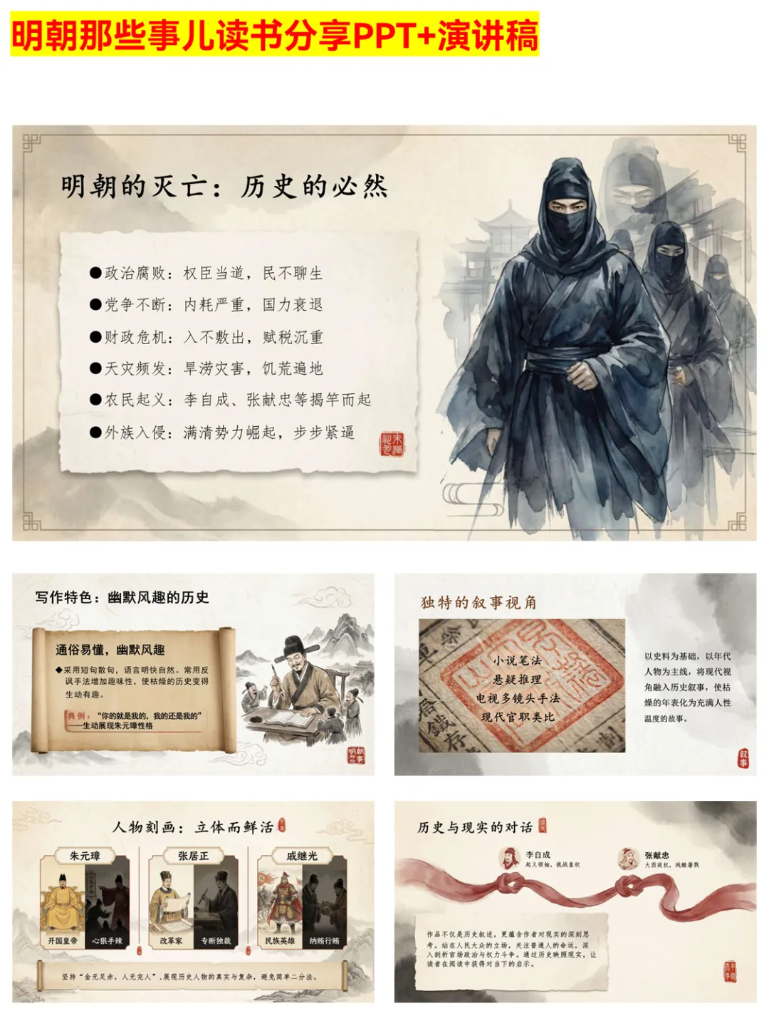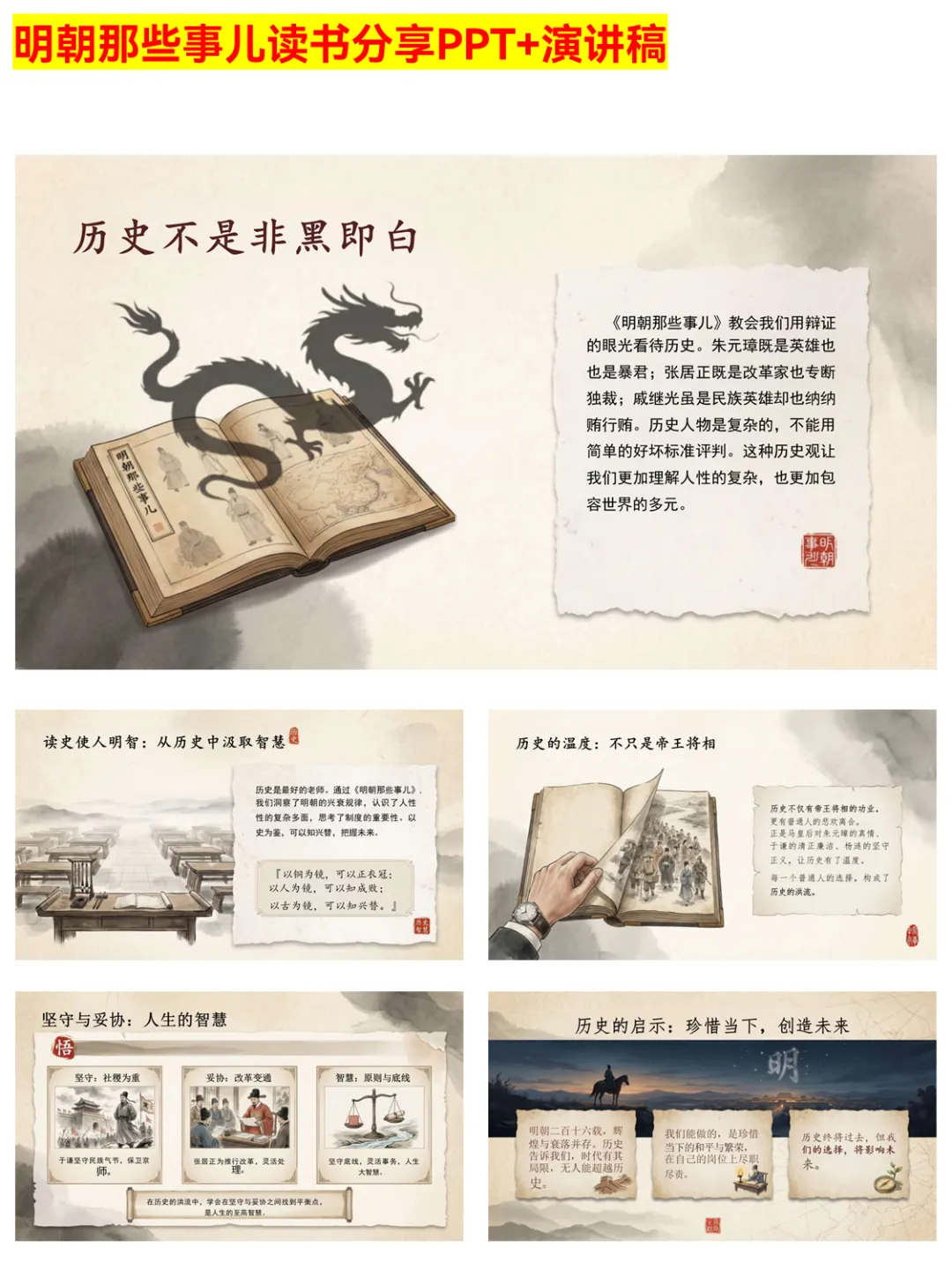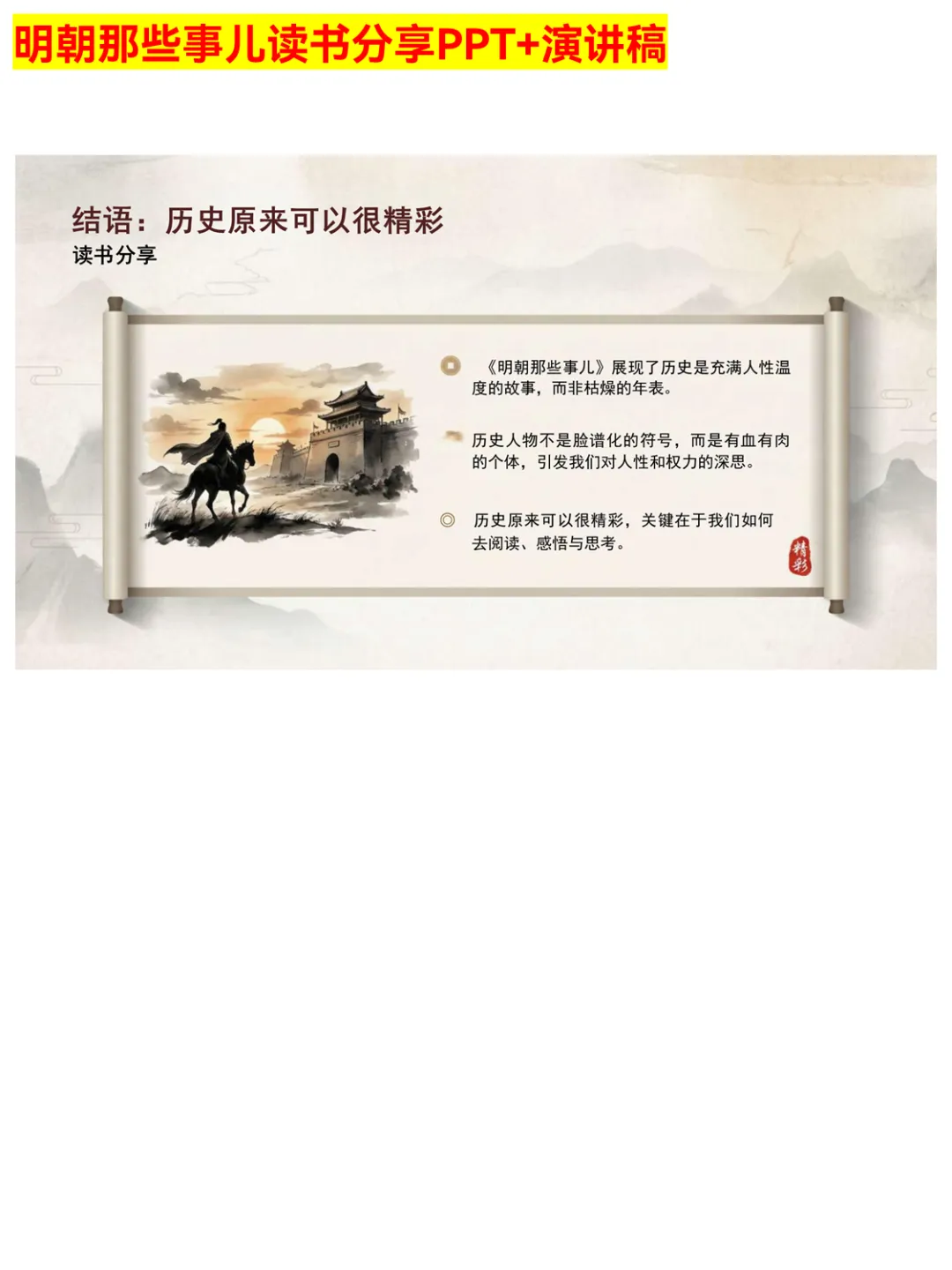 明史入门别再啃枯燥史书啦!这份《明朝那些事儿》读书分享PPT堪称宝藏~ 从作者当年明月的创作特色,到明朝重大事件、核心人物,再到历史启示与人生感悟,层层递进讲得明明白白。幽默风趣的表述+清晰的逻辑结构,还有“成功只有一个:按自己方式过人生”等深度思考,学生、历史小白、读书爱好者都能轻松看懂,赶紧码住~ #明朝那些事儿 #明史入门 #读书PPT #历史科普 #当年明月 #读书干货 #历史启示 #PPT分享 #明朝故事 #读书推荐