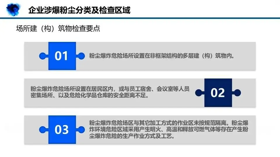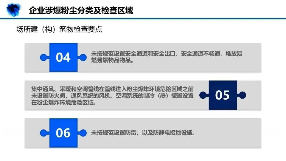明确了可燃性粉尘目录、爆炸危险场所划分,强调建(构)筑物结构、防火分区、安全通道、防雷防静电等基础安全要求。