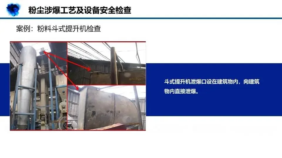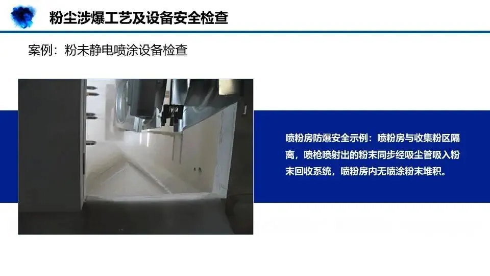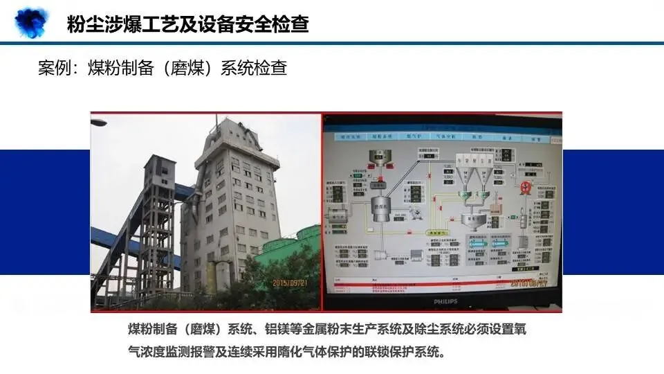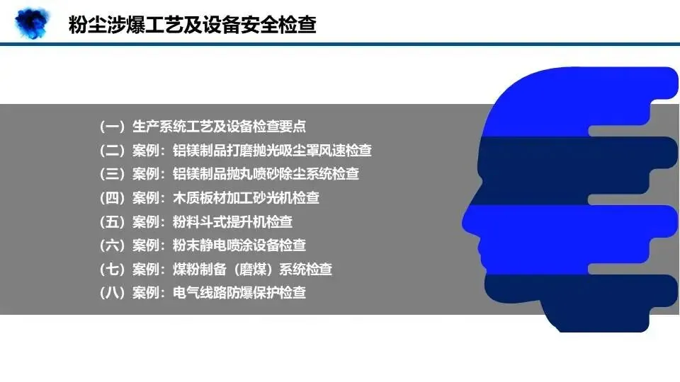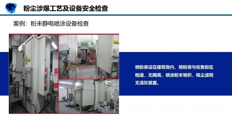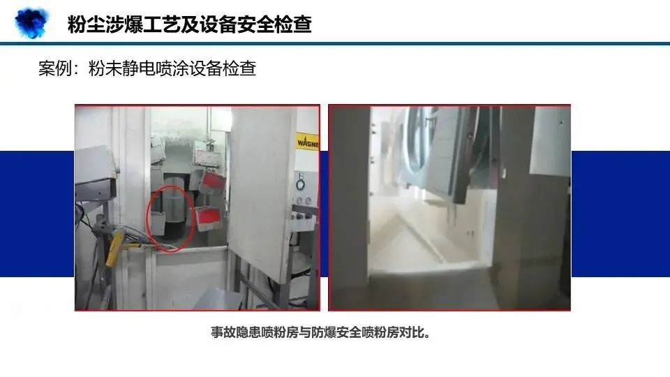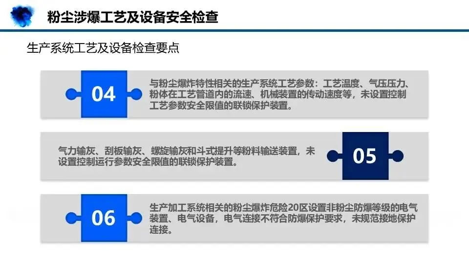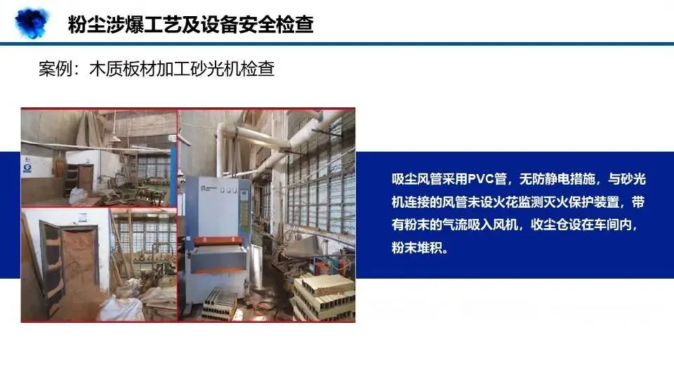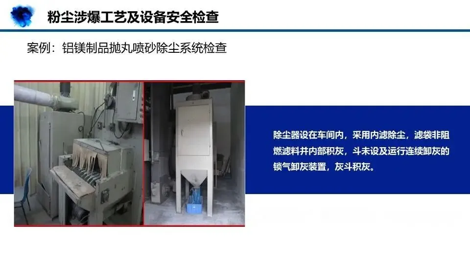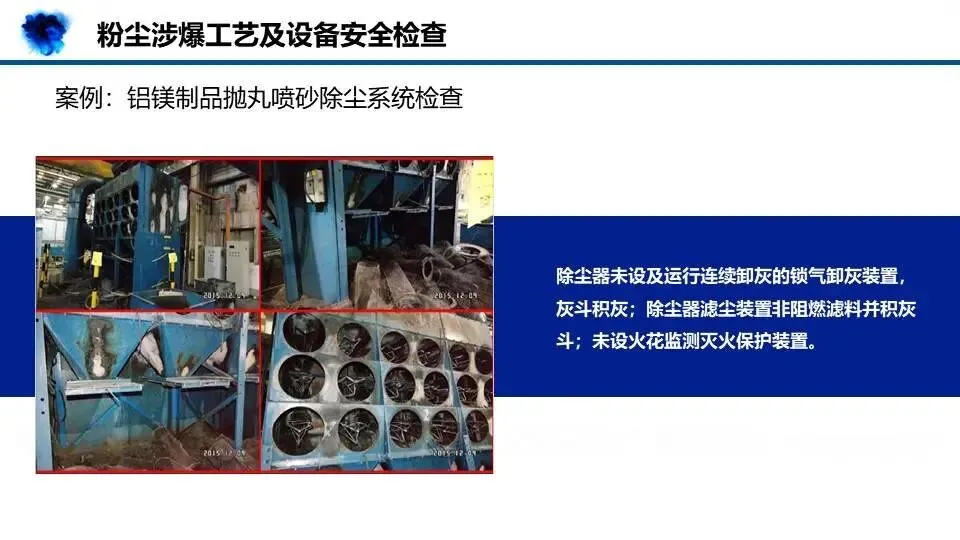聚焦打磨、喷砂、砂光、斗提、静电喷涂、磨煤等工艺,检查吸尘风速、火花探测、电气防爆、锁气卸灰等关键控制措施。