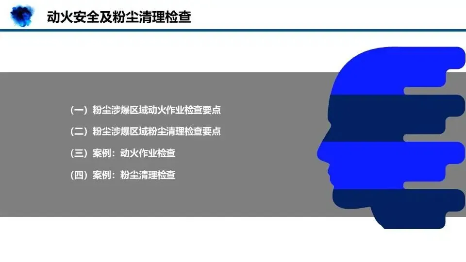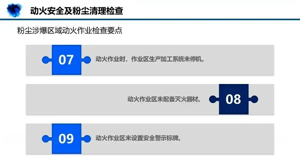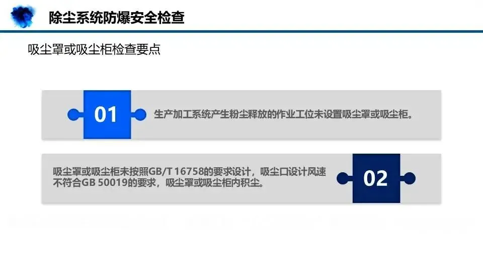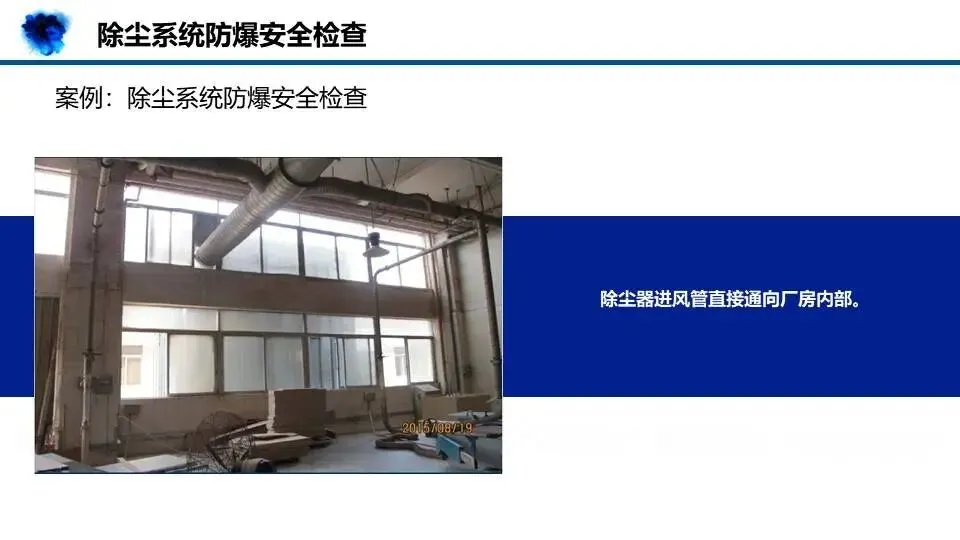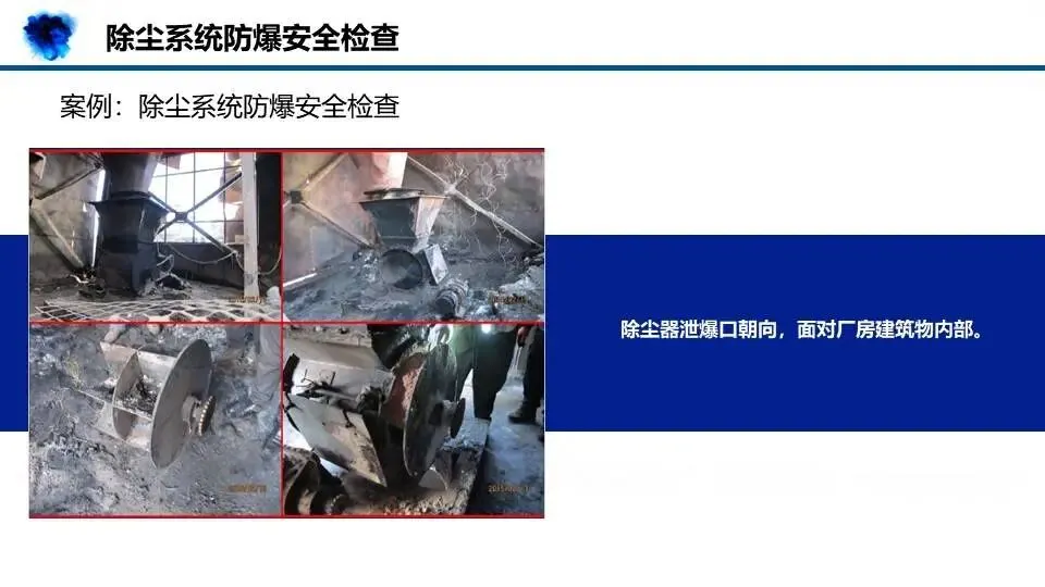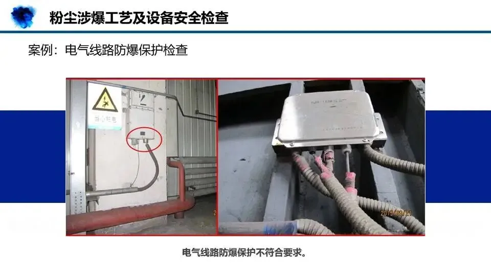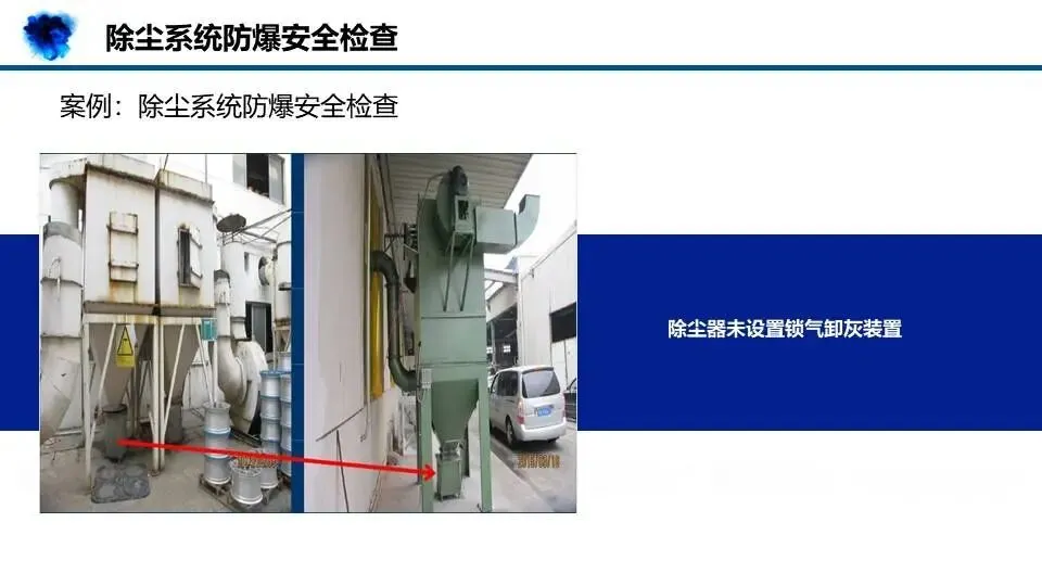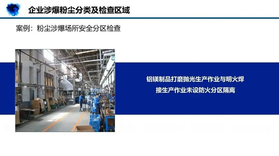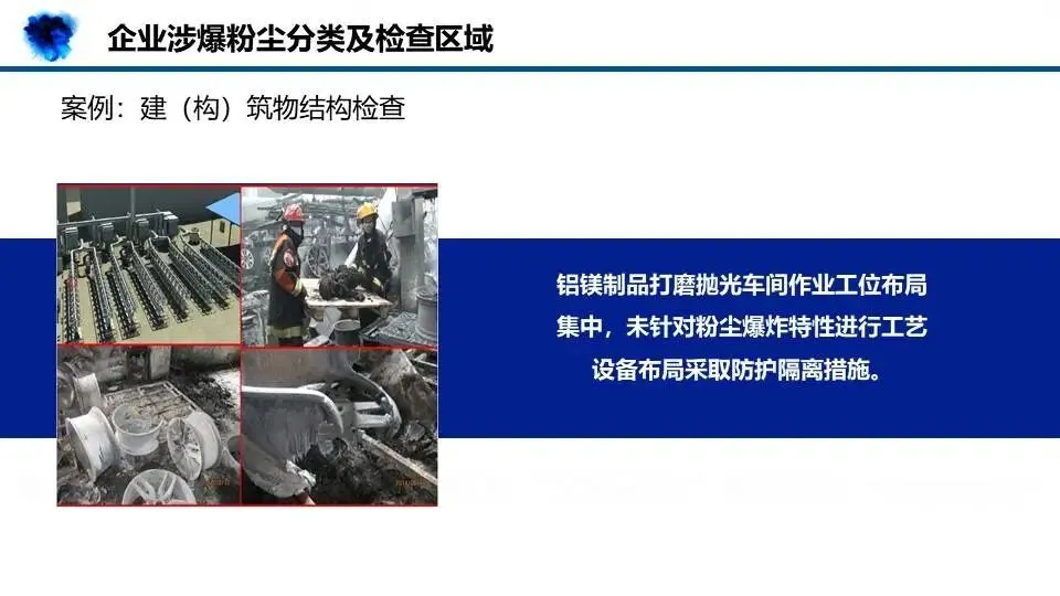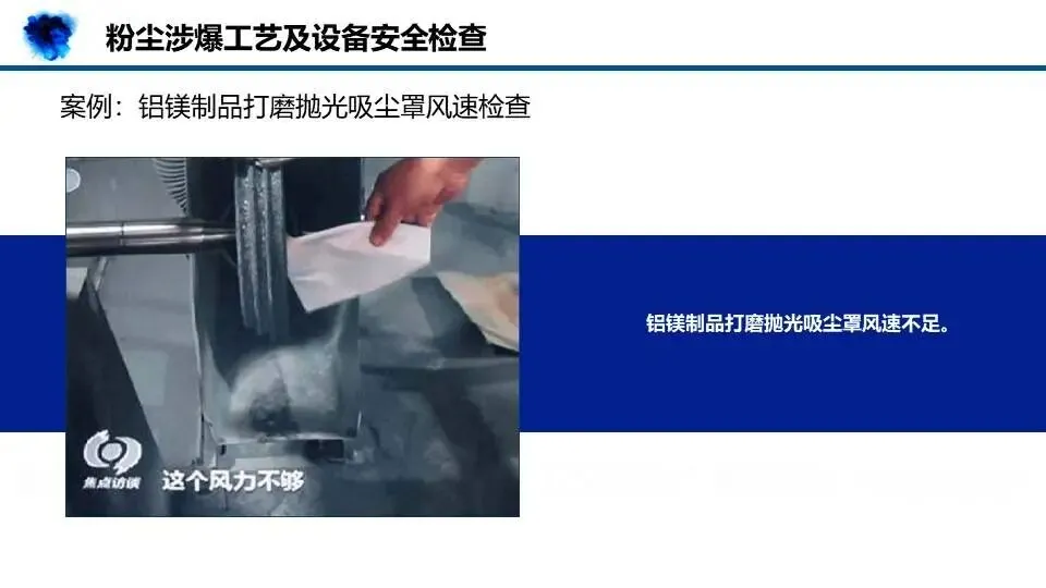 聚焦打磨、喷砂、砂光、斗提、静电喷涂、磨煤等工艺,检查吸尘风速、火花探测、电气防爆、锁气卸灰等关键控制措施。