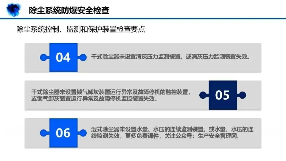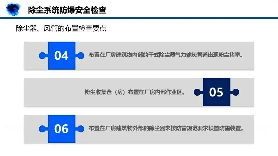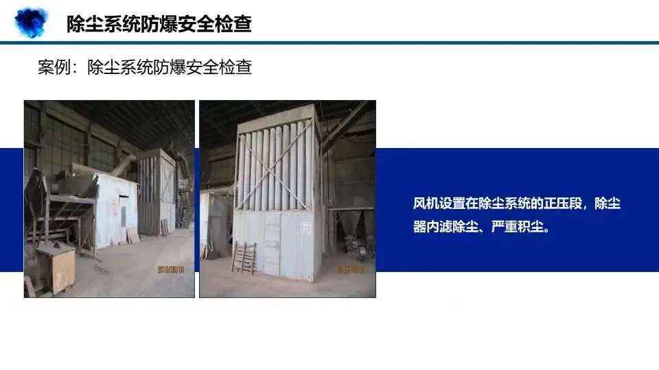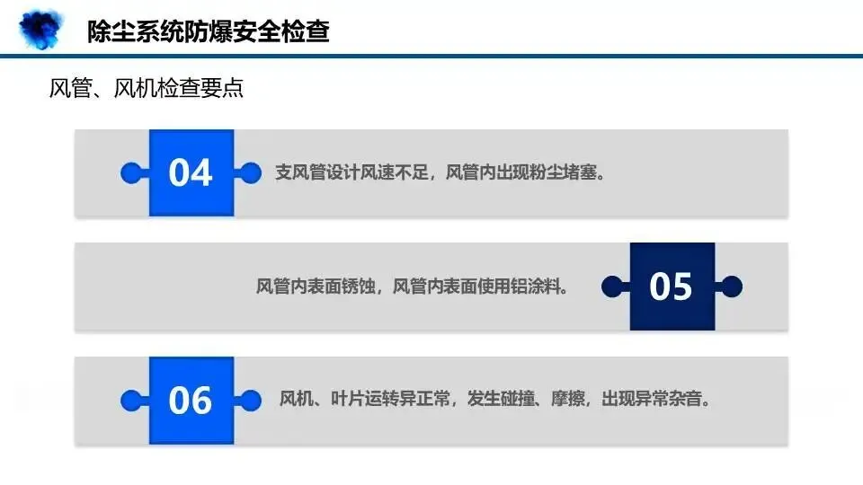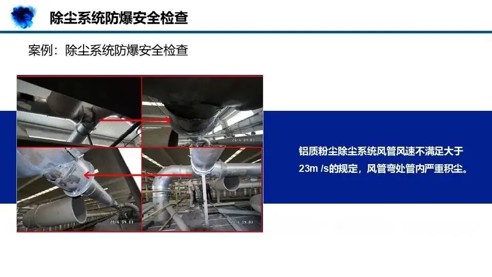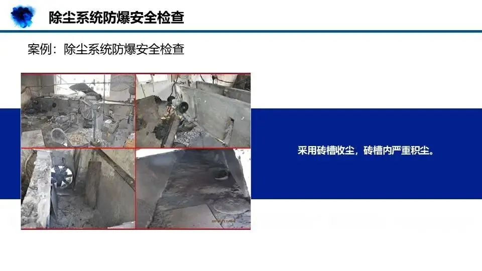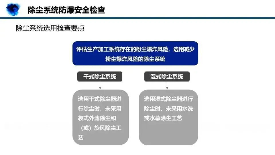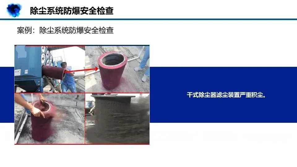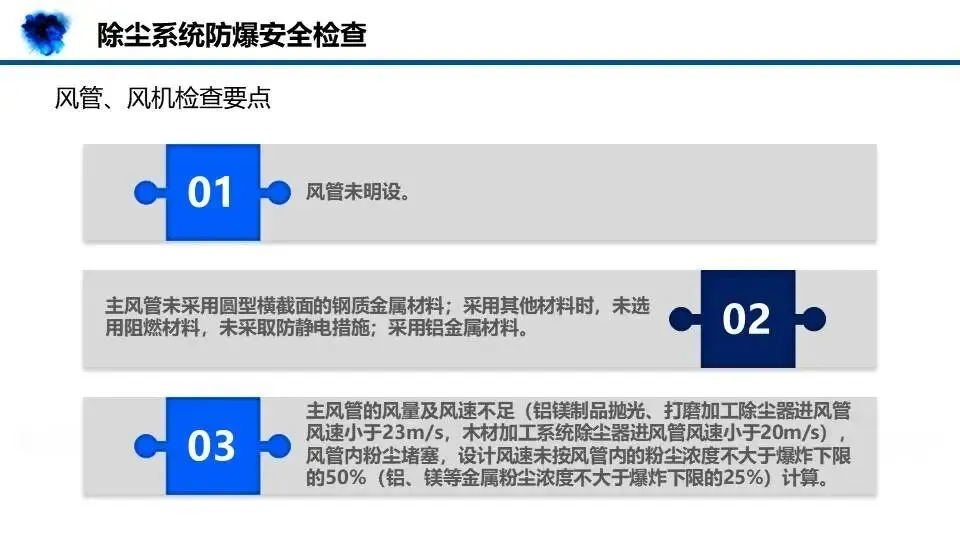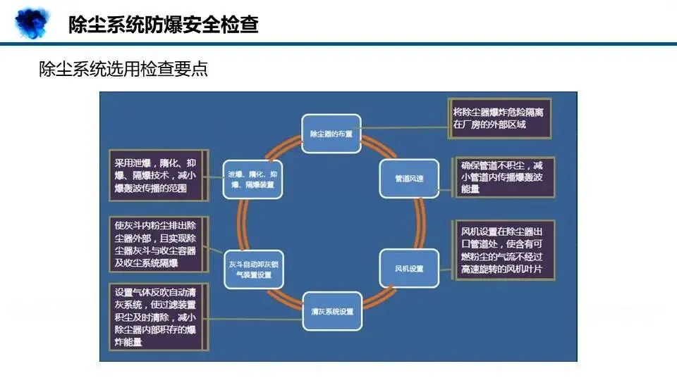 详细列出除尘系统(干式/湿式)在选型、风管、风机、监测装置、布置等方面的检查要点,强调防止积尘、正压运行、泄爆口设置等关键隐患。