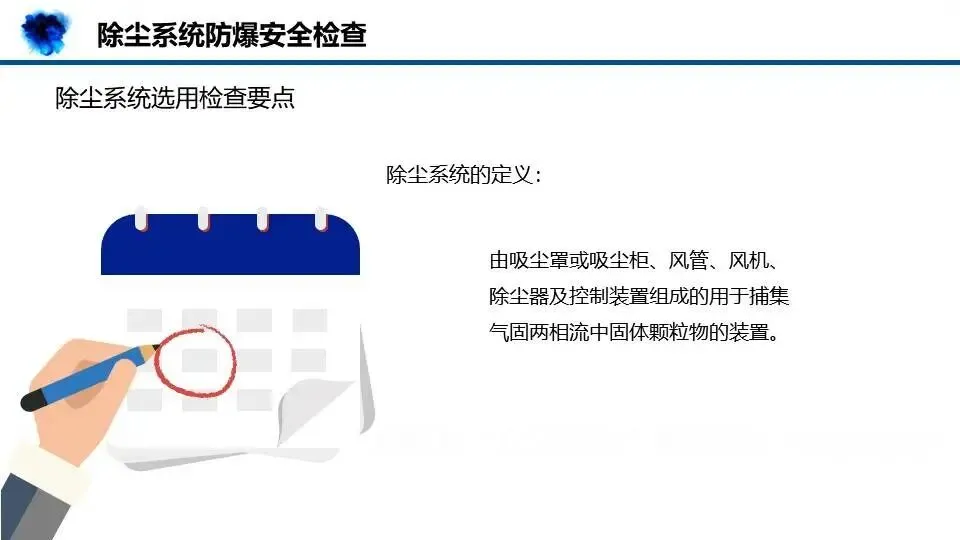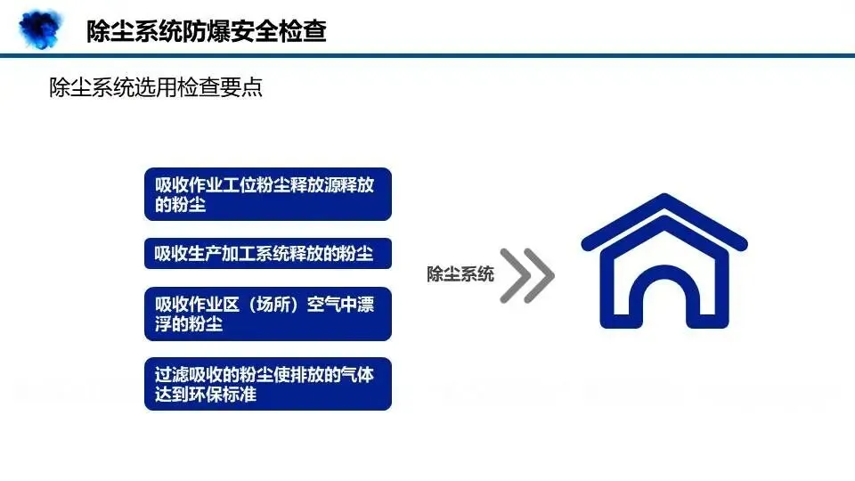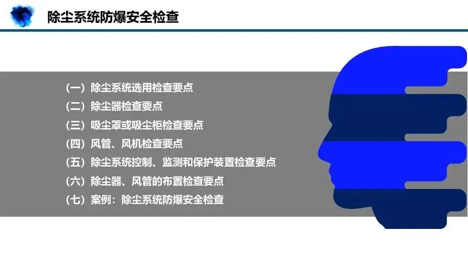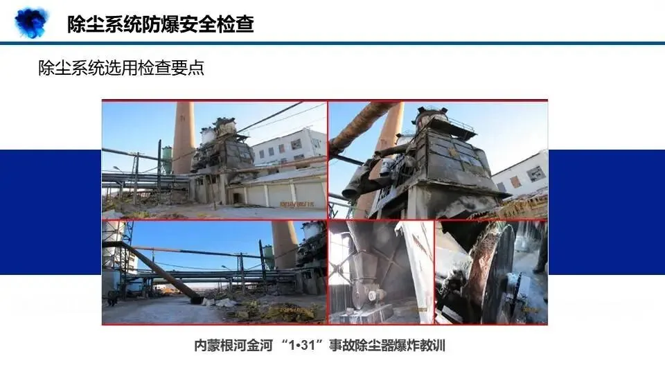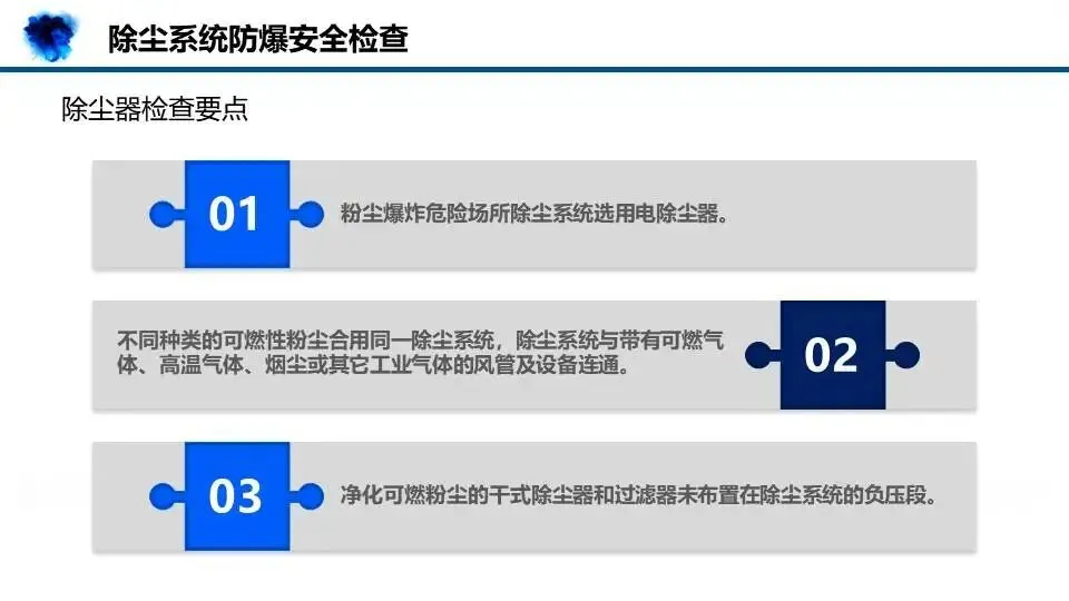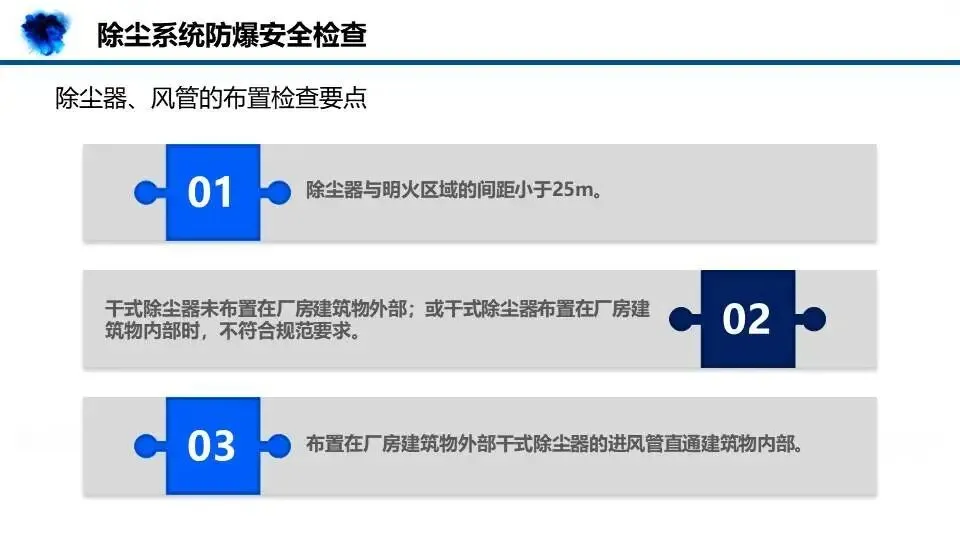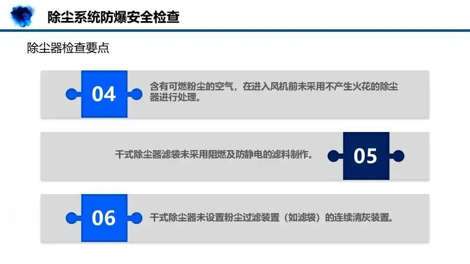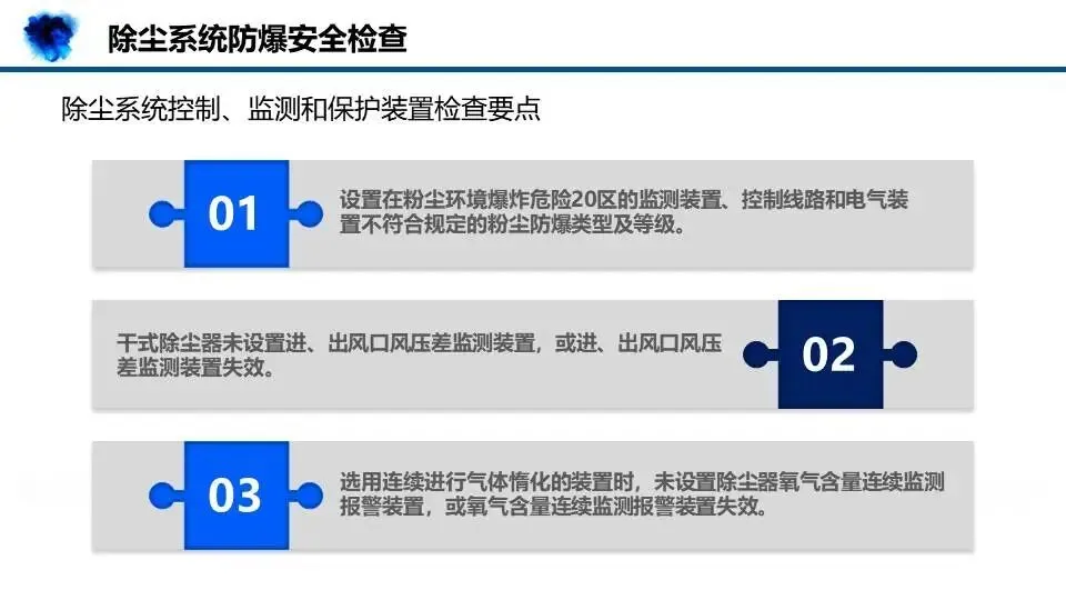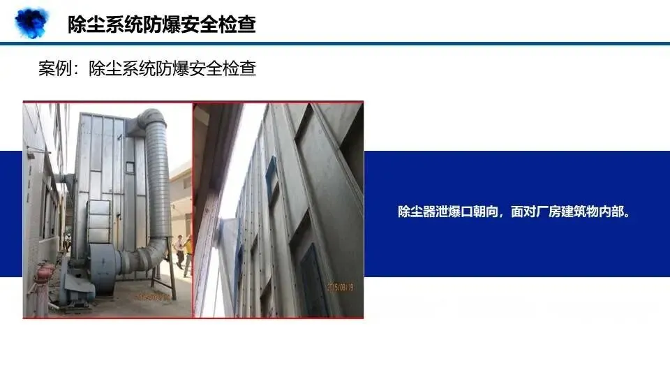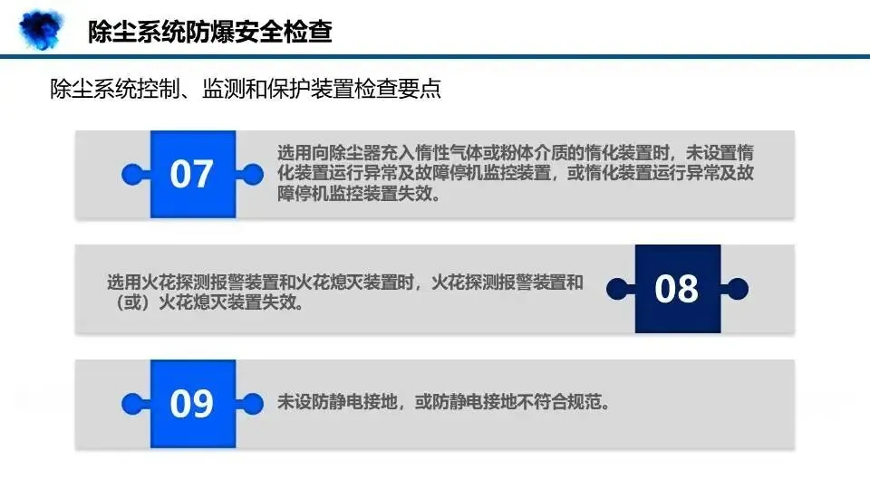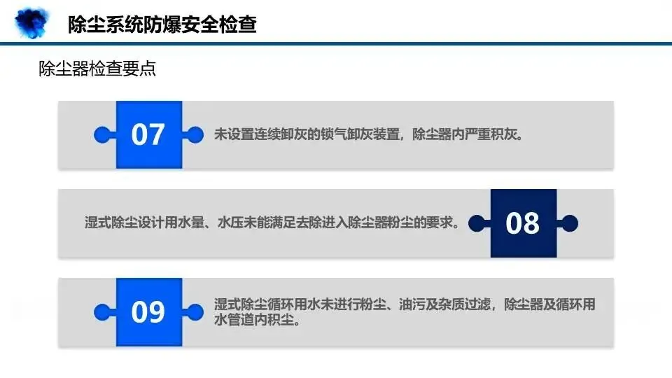 详细列出除尘系统(干式/湿式)在选型、风管、风机、监测装置、布置等方面的检查要点,强调防止积尘、正压运行、泄爆口设置等关键隐患。