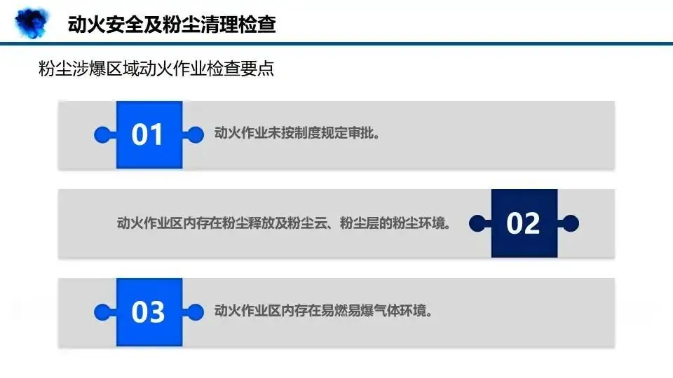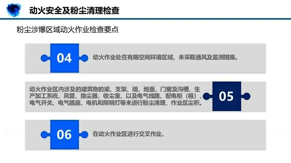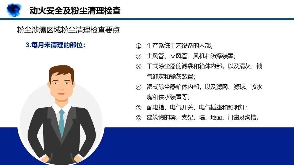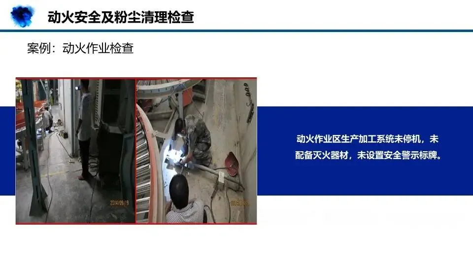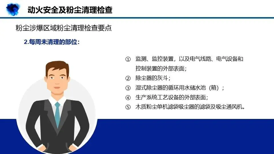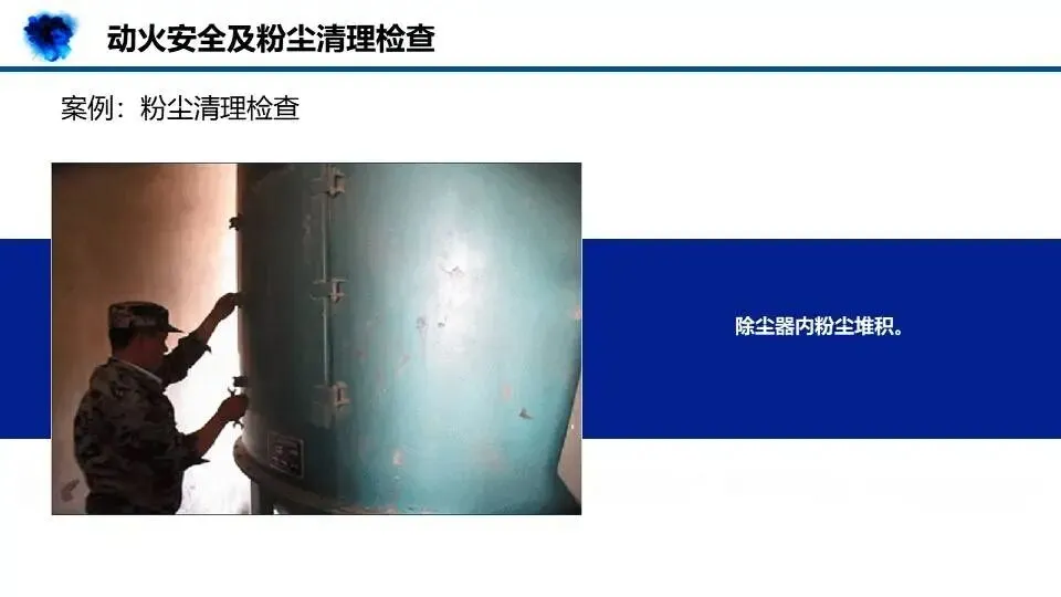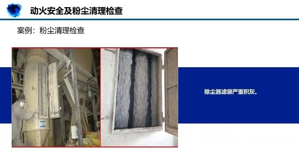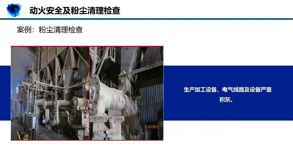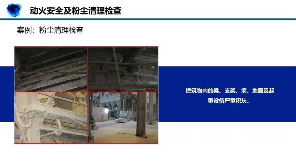 规定动火作业审批、作业区粉尘清理、设备停机、消防器材配备等要求,并按每班、每周、每月明确粉尘清理的具体部位。