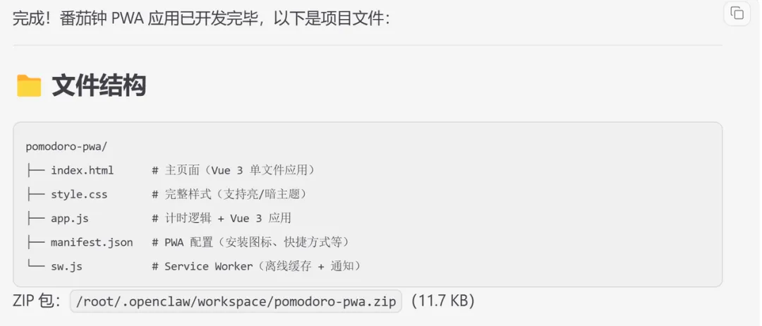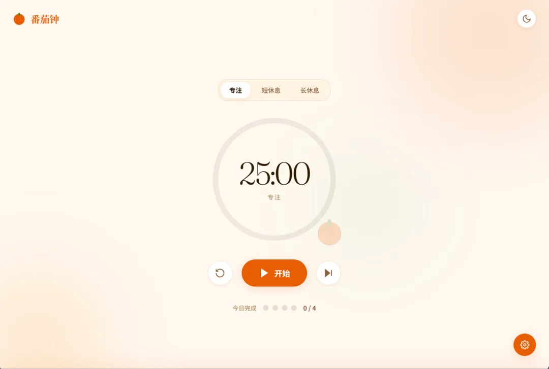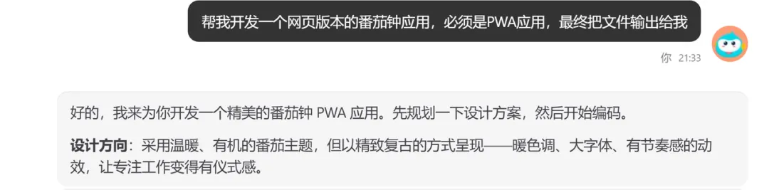 具体的测试任务是开发一个网页版本的番茄钟应用,最近玩AI编程太入迷腰有点痛,正好搞个小工具提醒自己定时运动。先输入指令: