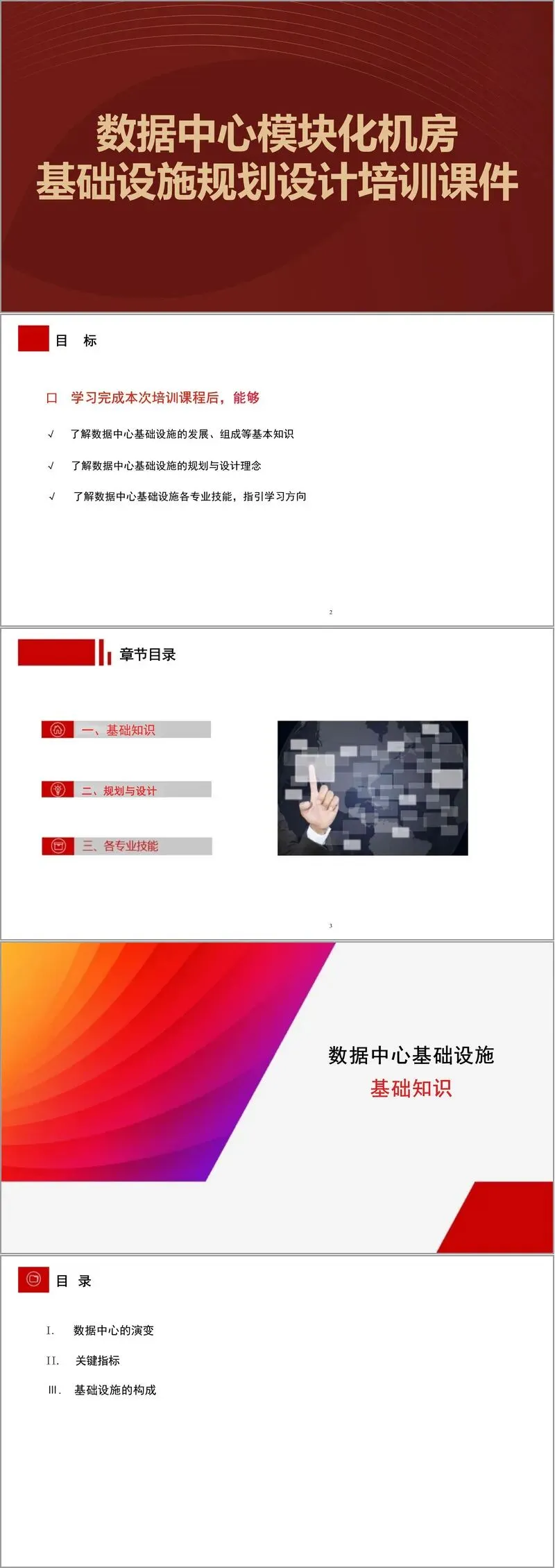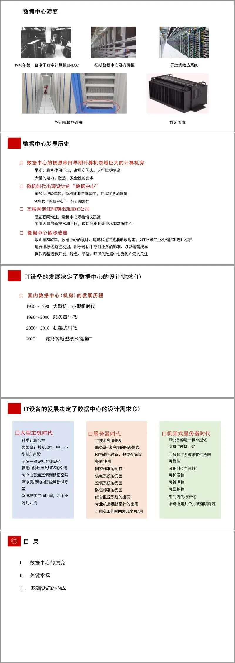 作为专注于数据中心基础设施设计的专业人士,笔者对这份培训材料进行了全面分析。该文档系统性地阐述了模块化数据中心基础设施的规划与设计要点,为从业人员提供了从基础理论到实践应用的全方位指导。