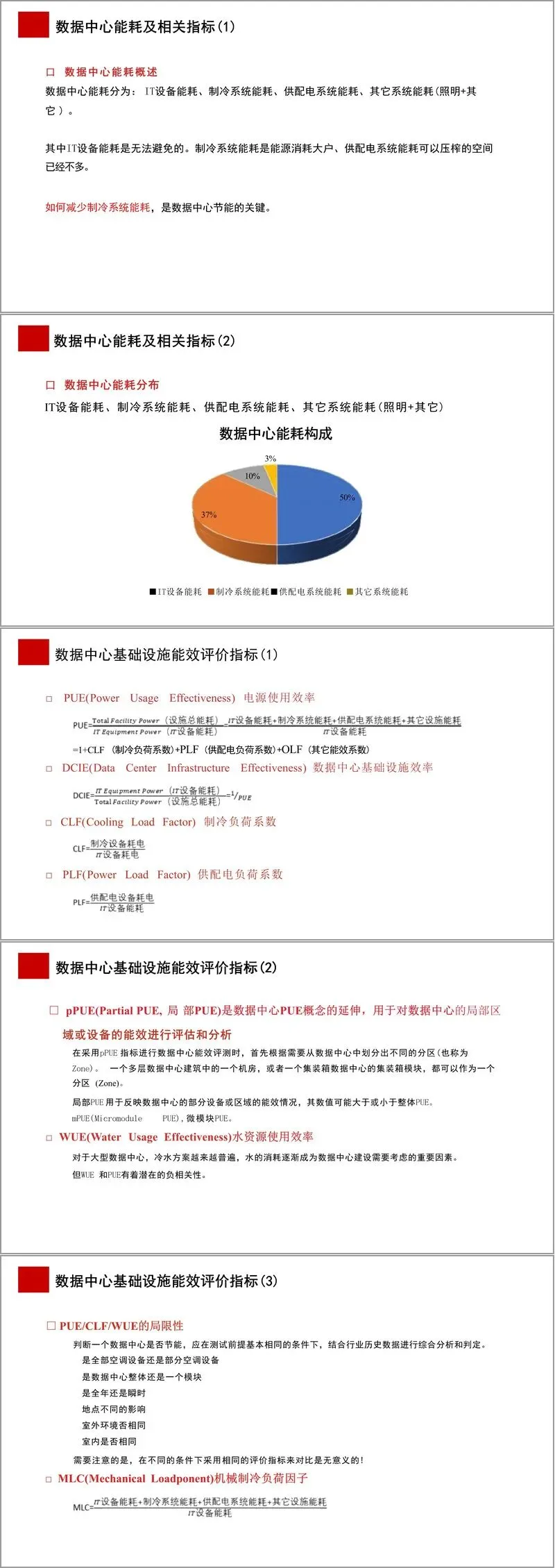 近年来,随着水资源重要性提升,WUE(水资源使用效率)指标也逐渐受到重视。需要注意的是,这些指标的应用必须考虑具体测试条件,避免在不同前提下的简单对比。评估数据中心是否节能,应在测试条件基本相同的背景下,结合行业历史数据进行综合分析判断。