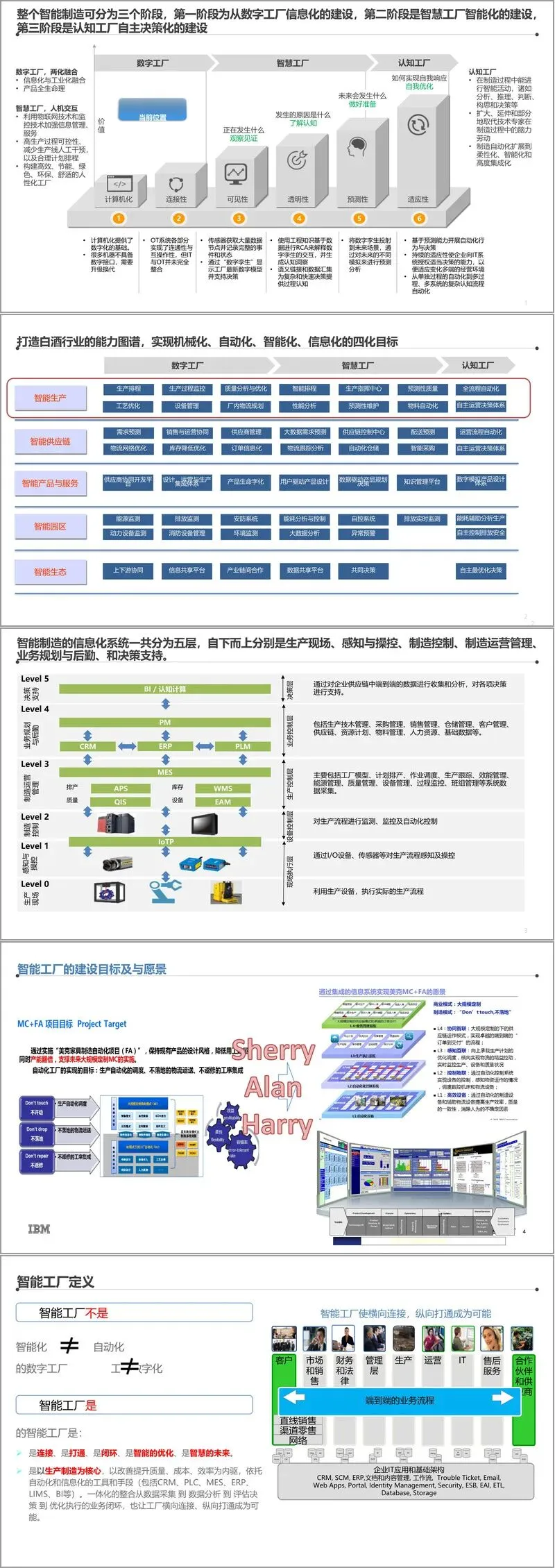 咨询工作的核心是进行顶层架构设计,其蓝图规划遵循智能制造的国际先进理念。规划将智能工厂建设分为三个渐进阶段:数字工厂(信息化与工业化融合)、智慧工厂(人机交互、高度集成化)和认知工厂(自主决策、自我优化)。整个架构被划分为六个层级:Level 0生产现场、Level 1感知与操控、Level 2制造控制、Level 3制造运营管理(MES等)、Level 4业务规划与后勤(ERP等)、Level 5决策支持(BI/认知计算)。该架构旨在实现两大集成:纵向打通从设备层到决策层的所有信息流,横向集成从客户需求到研发、计划、采购、生产、物流、销售、服务的端到端价值链。