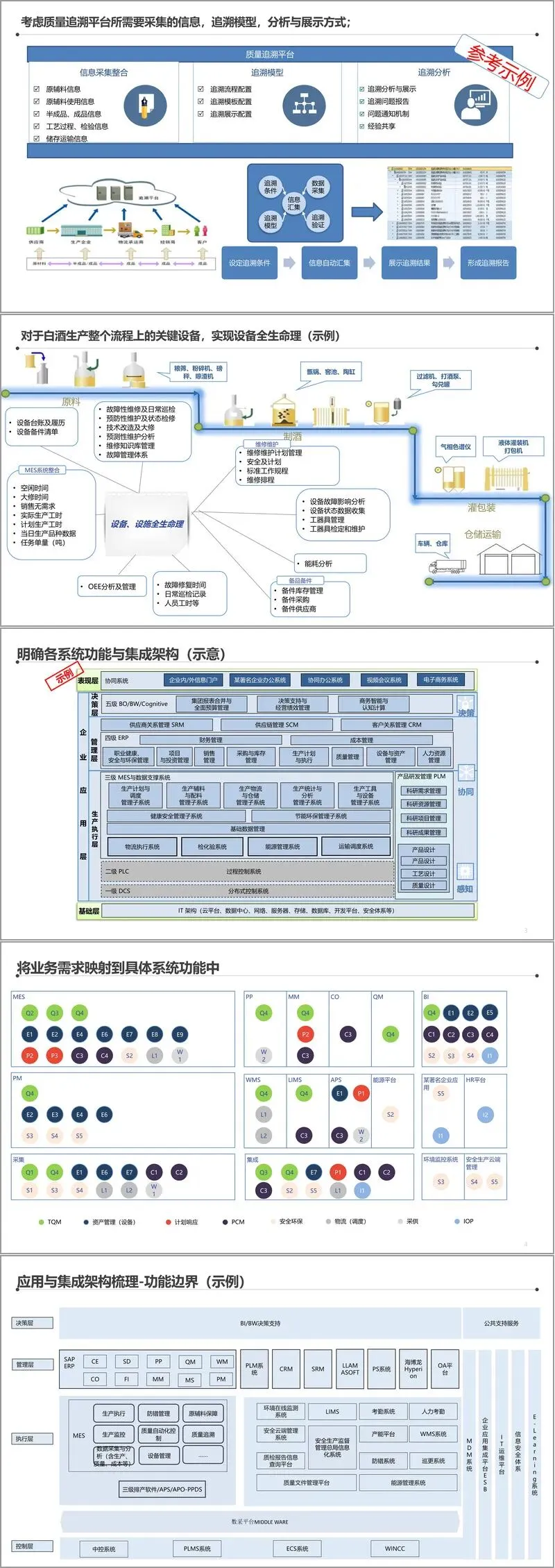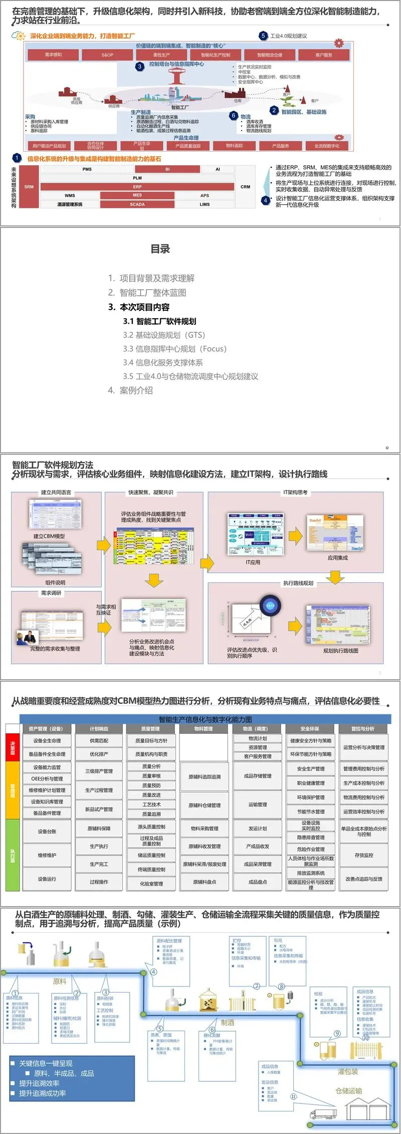 首先是智能工厂软件系统规划。该方法论基于业务组件模型(CBM),通过评估各业务组件的战略重要性与管理成熟度,识别出需要重点改进的“热点”。例如,在质量管理领域,规划了覆盖从原辅料检验、制酒、勾兑、灌装到成品出厂的全流程质量数据采集与追溯平台,旨在实现关键质量信息的一键追溯与分析。在生产执行层面,明确了以MES(制造执行系统)为核心,并与上层的ERP、PLM(产品生命周期管理)以及底层的自动化设备(如SCADA、DCS、PLC)进行深度集成,确保生产计划、物料消耗、设备状态、质量数据的实时同步。
