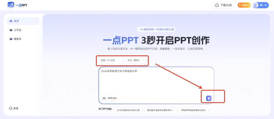 当你临时接到汇报任务,只需输入一句话主题(如"2026年新能源汽车市场趋势分析")。