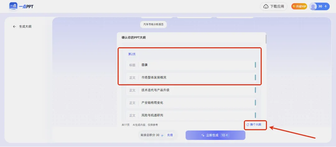 点击生成后,AI会立即输出符合要求的大纲。可根据需要对大纲进行手动调整,想改哪里改哪里;若对整体不满意,也可点击右下角重新生成大纲。