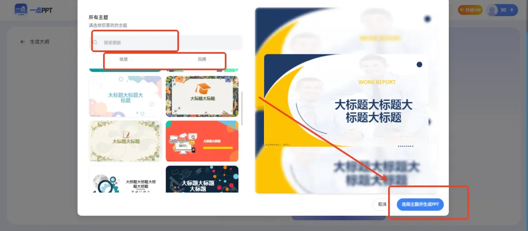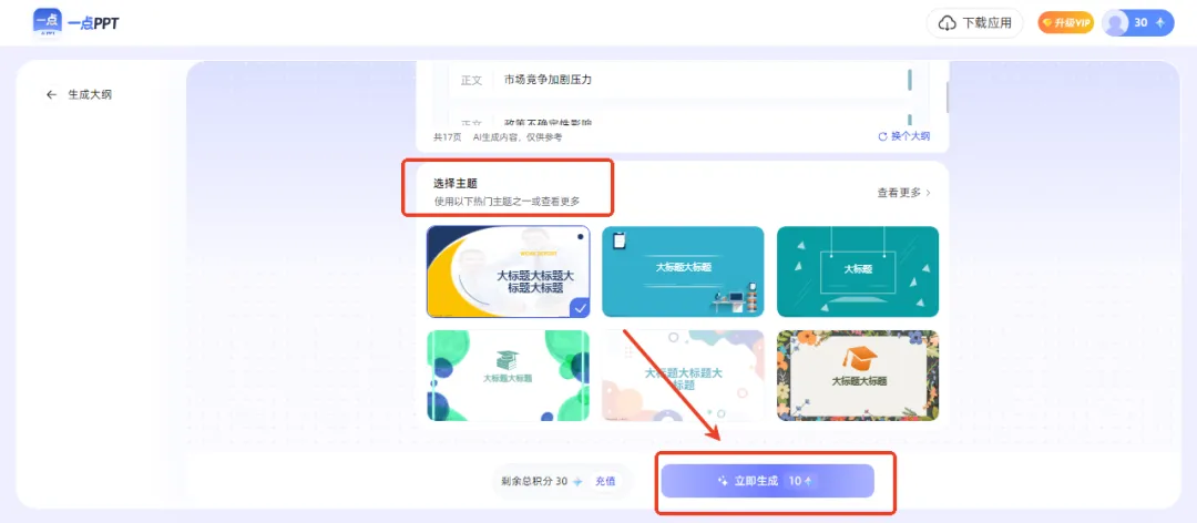 大纲调整完毕后,下滑进入下一步,选择PPT主题。页面下方会提供热门主题,也可点击右上角“查看更多”进入模板库,根据主题和风格挑选合适的模板,或自行搜索。选定后,点击生成PPT即可。