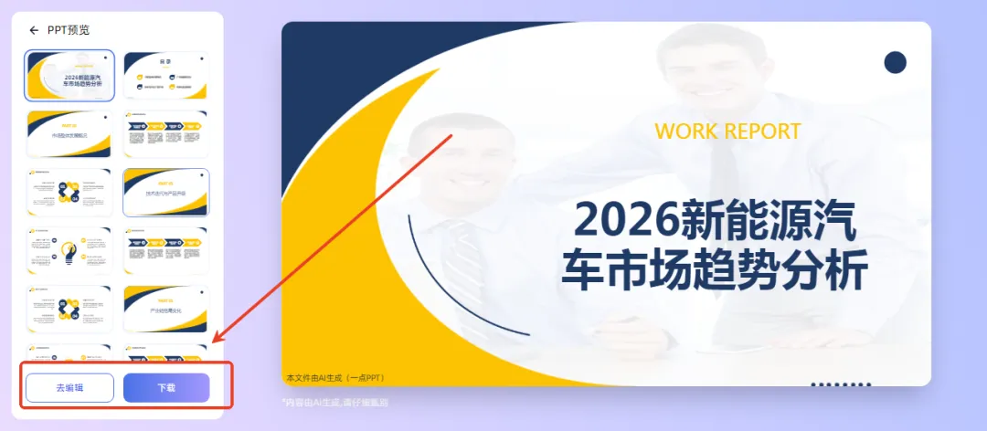 AI就能自动生成结构完整的演示文稿,生成初版仅需几秒钟的时间,大幅缩短传统PPT制作的时间。点击可以去编辑或直接下载。