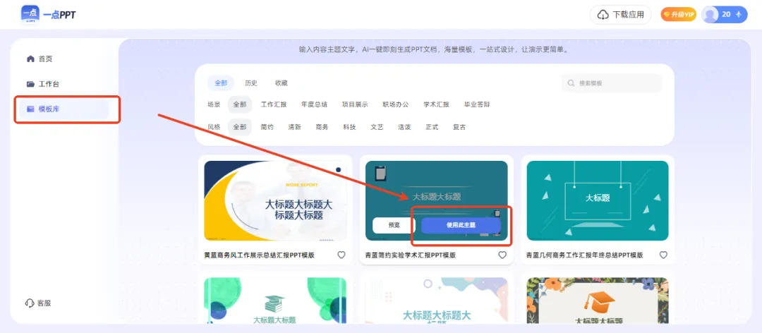 一点PPT提供海量模板库,其主题风格覆盖各类场景,从商务风、简约风到科技风、政务风,一点PPT里有大量按场景、行业、风格分类的设计模板。可直接使用主题进行制作。