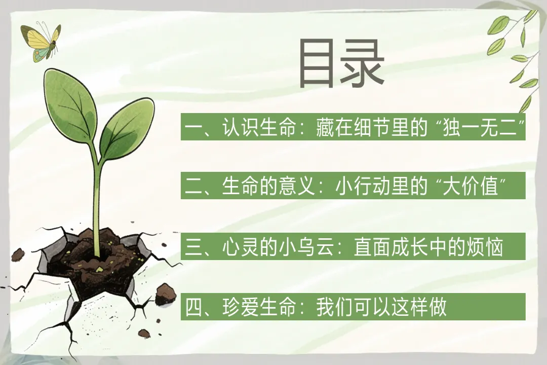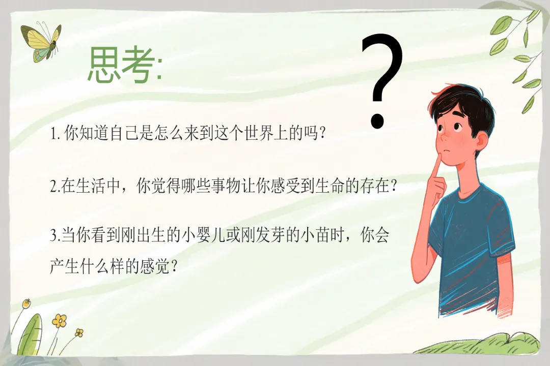 各位同学,今天我们开这个心理健康主题班会,主题是珍爱生命,解锁成长的小美好。首先大家先想几个问题,你知道自己怎么来到这个世界的,生活里哪些事物能让你感受到生命,看到小婴儿、小苗芽是什么感觉。大家也可以做个生命小侦探,看看身边的事物哪些有生命,这些有生命的东西每天怎么活着,其实努力生存本身就是一种美好。