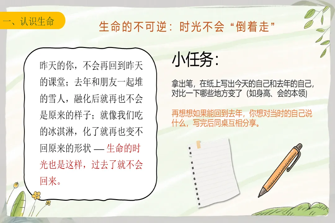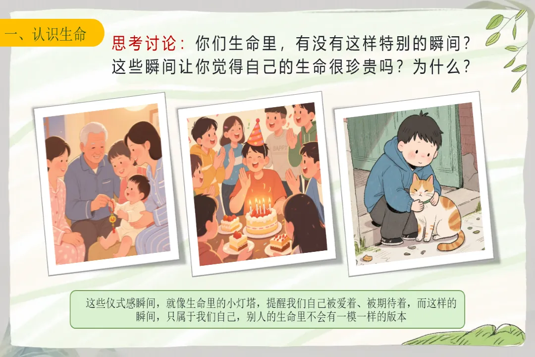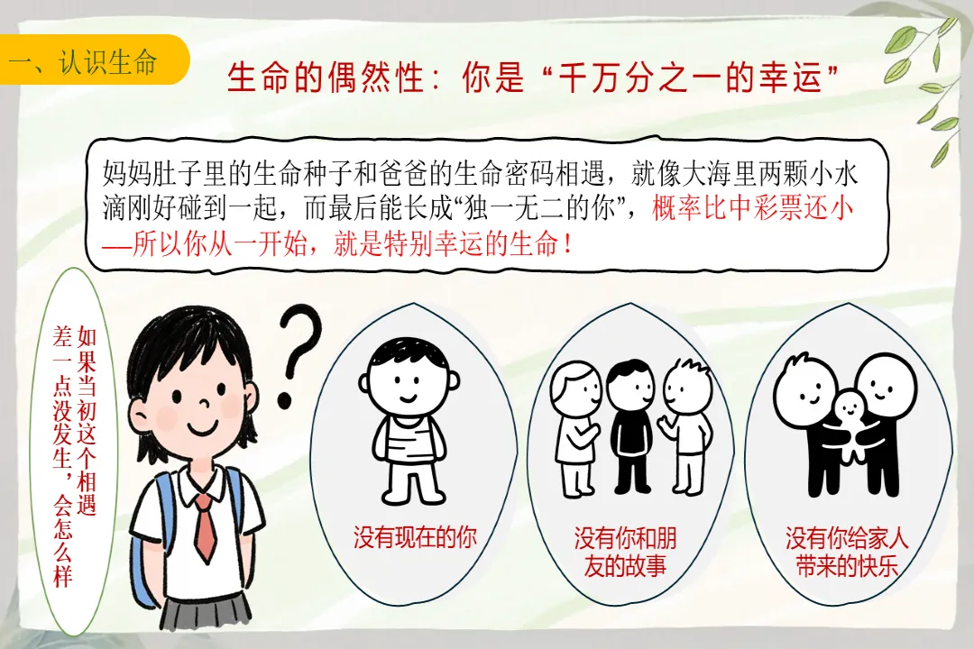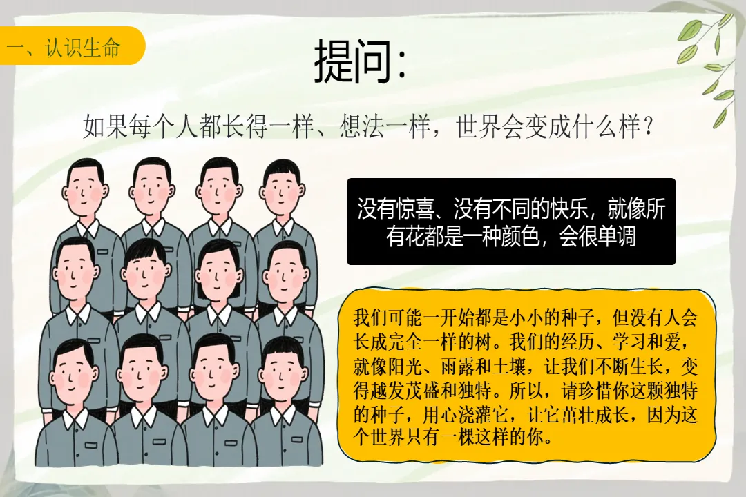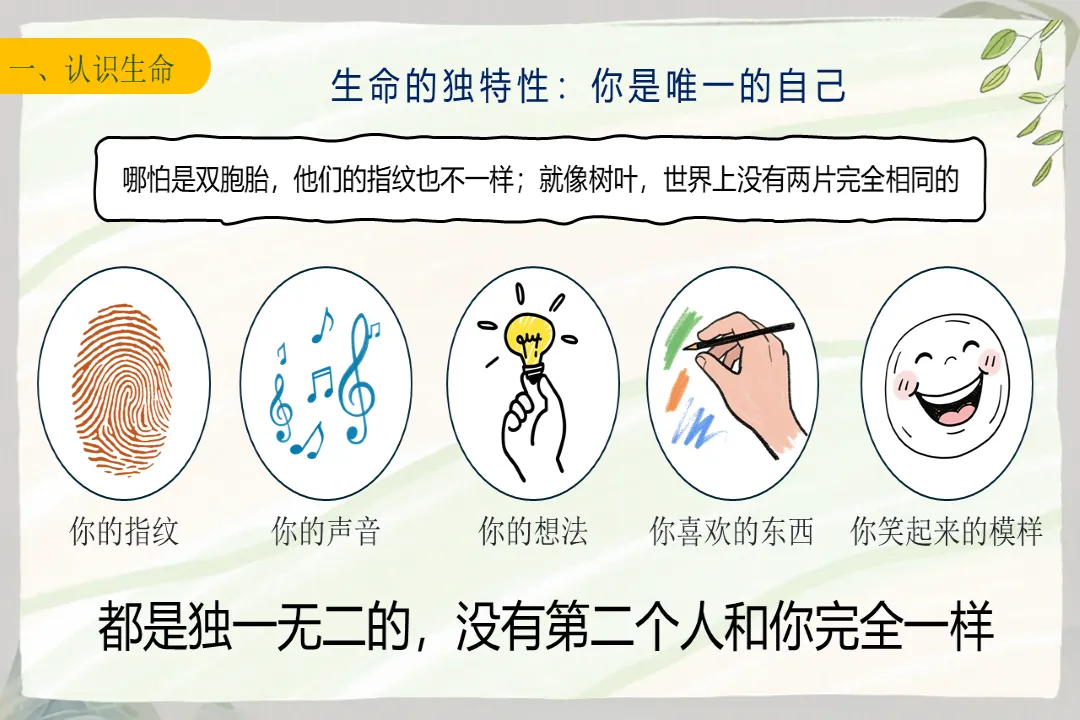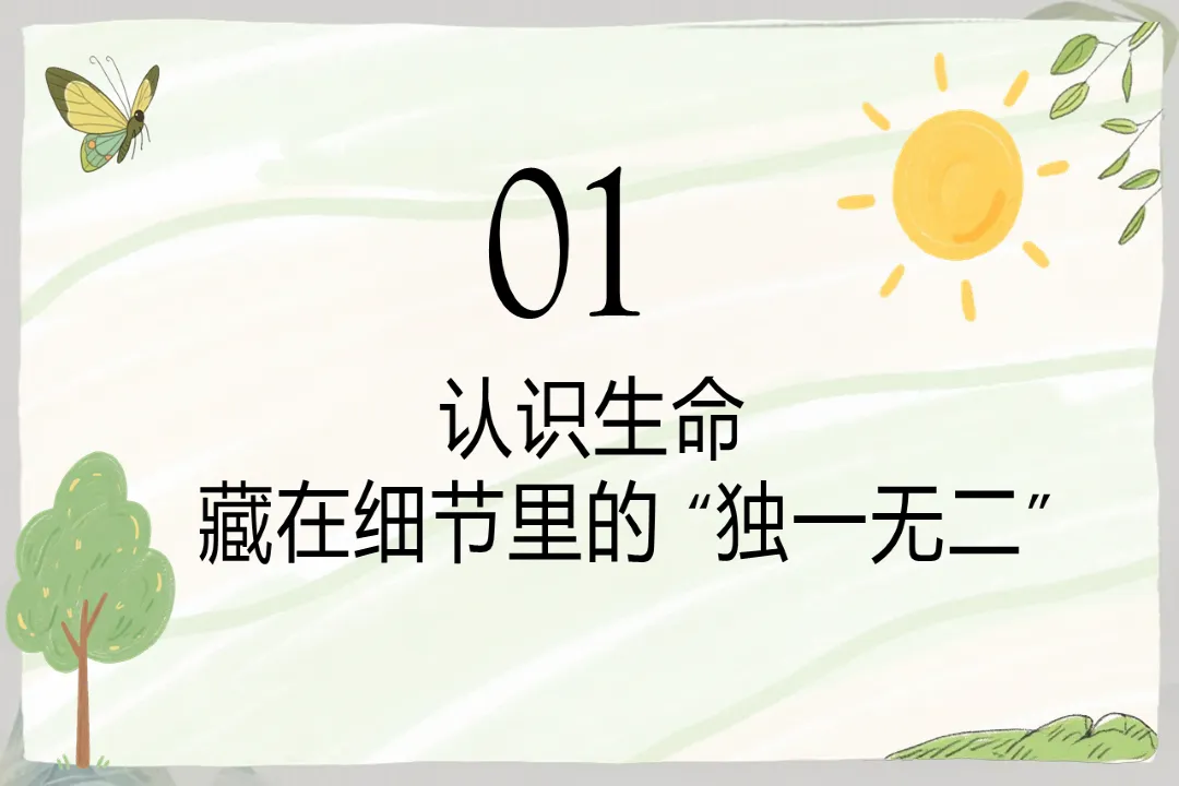 我们先说说认识生命这件事。每个人的生命都是独一无二的,你能来到这个世界,是千万分之一的幸运,爸妈的生命种子相遇,才才有了现在的你,少一点缘分,就没有现在的一切。而且生命是不可逆的,时间走了就回不来,去年的你和今天的你不一样,过去的事也没法重来。还有,每个人都是唯一的,指纹、声音、想法都不一样,就算是双胞胎也有差别,要是所有人都一样,世界就会特别单调。