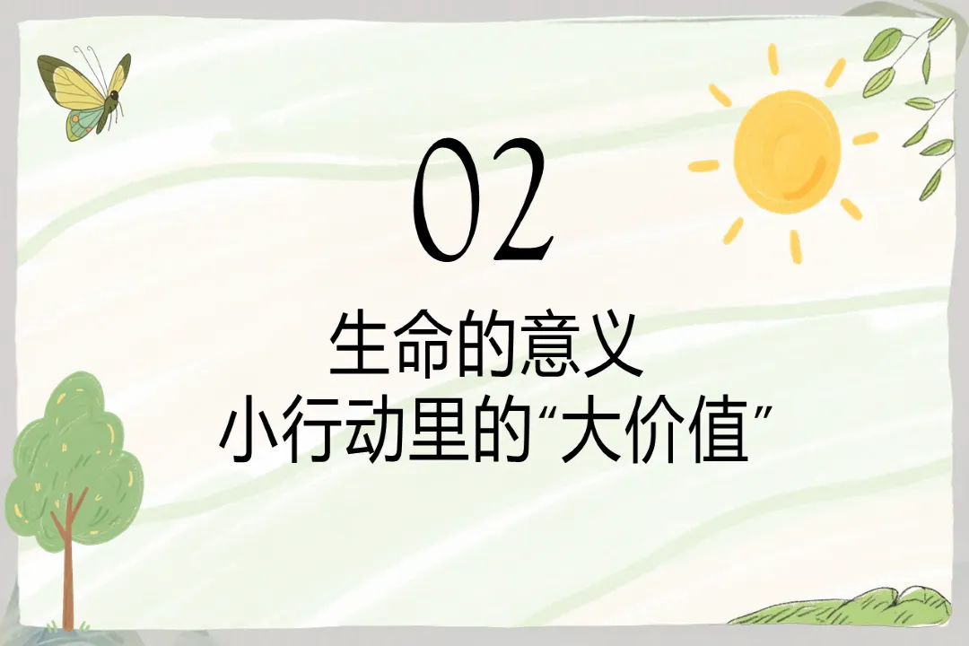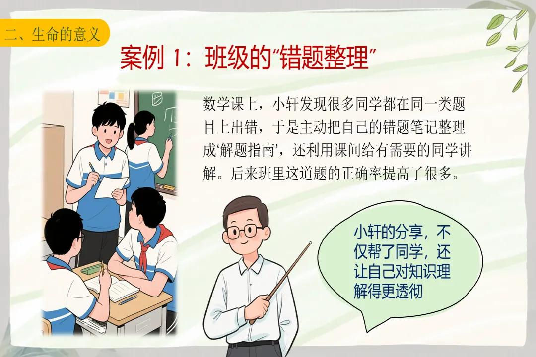 再说说生命的意义,其实都在小行动里。班里有同学整理错题帮大家,有同学发起旧书传递帮别人,这些小事都有价值。你们平时帮同学、做班级事、在社区出力,也都是在实现生命的意义。不同的人有不同的生命意义,老师教书,科学家探索,消防员救人,我们学生的话,就是爱自己、爱他人,用自己的特长做些事,给身边人带来美好。