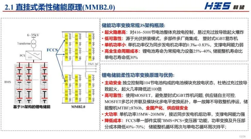 然后是柔性储能技术 2.0(MMB2.0),解决了之前储能起火隐患高、单机功率小、成本高的问题,不仅起火几率大幅降低,单机功率能到 35-200MW,还能降低 40%-70% 的成本,实际项目运行效果也不错。