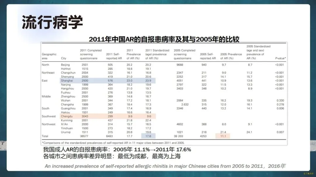 今天我们来聊一聊一个非常常见的疾病——过敏性鼻炎。很多人觉得它只是“小毛病”,但实际上,它是一种由免疫球蛋白E介导的鼻黏膜慢性炎症性疾病,近年来在我国的患病率持续上升,从2005年的11.1%增加到2011年的17.6%,已经成为影响生活质量的重要呼吸道疾病。