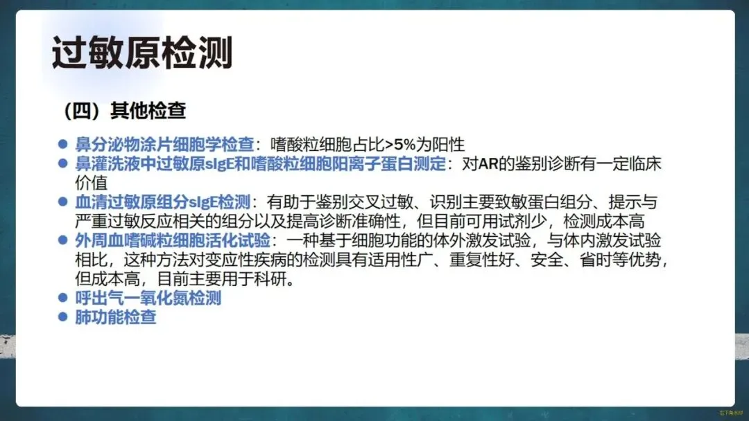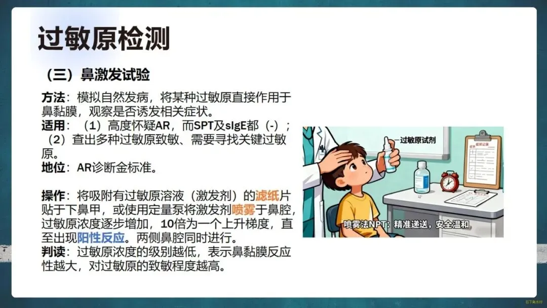 在诊断方面,我们主要依靠临床表现、皮肤点刺试验、血清特异性IgE检测,以及鼻激发试验这“金标准”。需要注意的是,检测结果阳性不代表一定有症状,必须结合患者的具体情况综合判断。