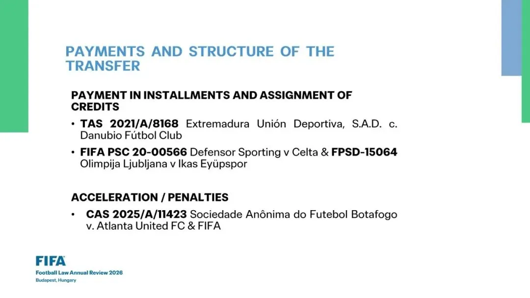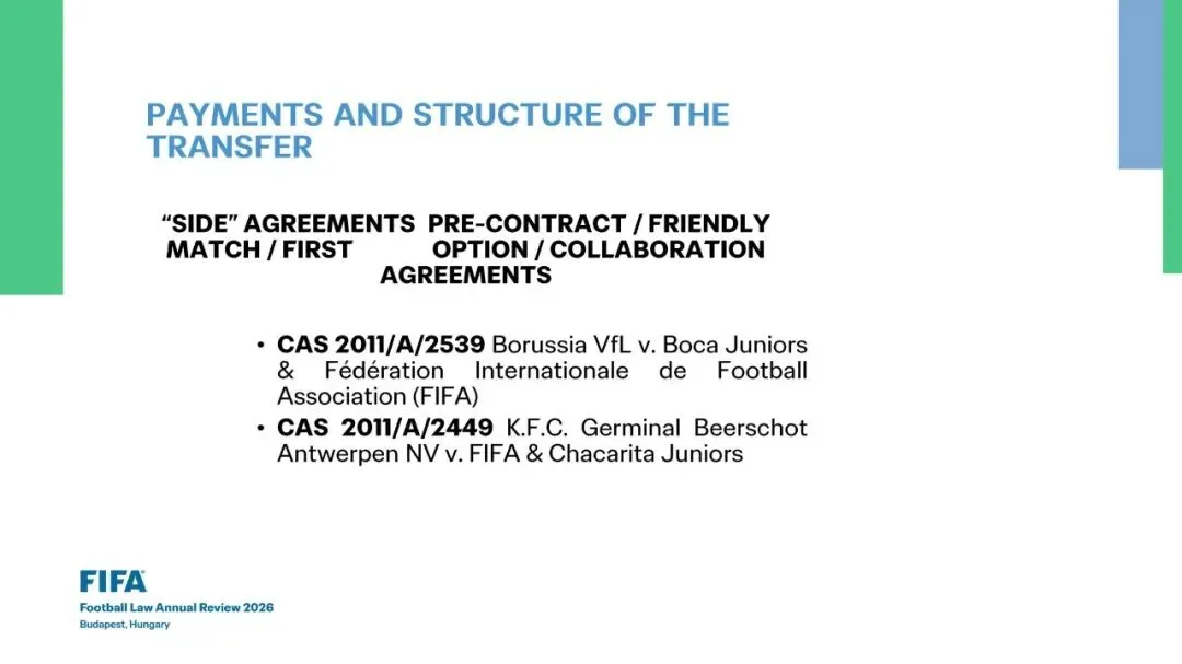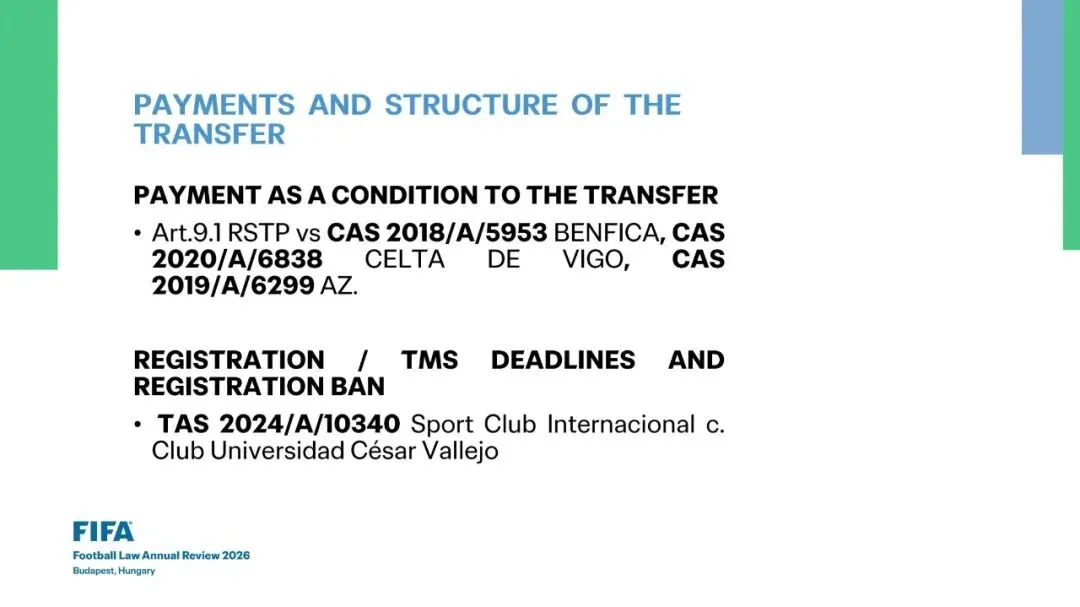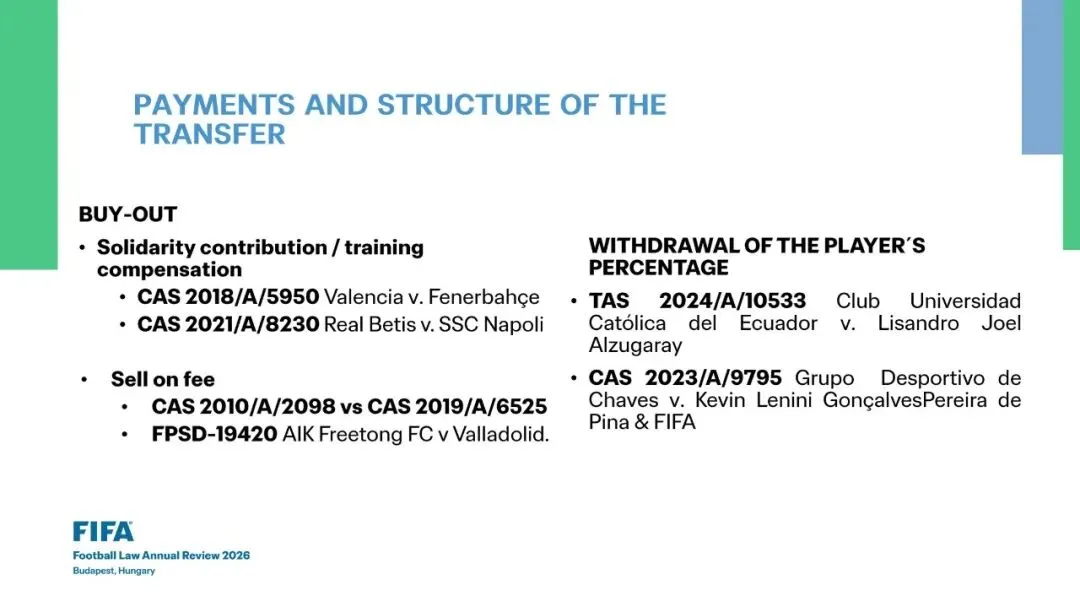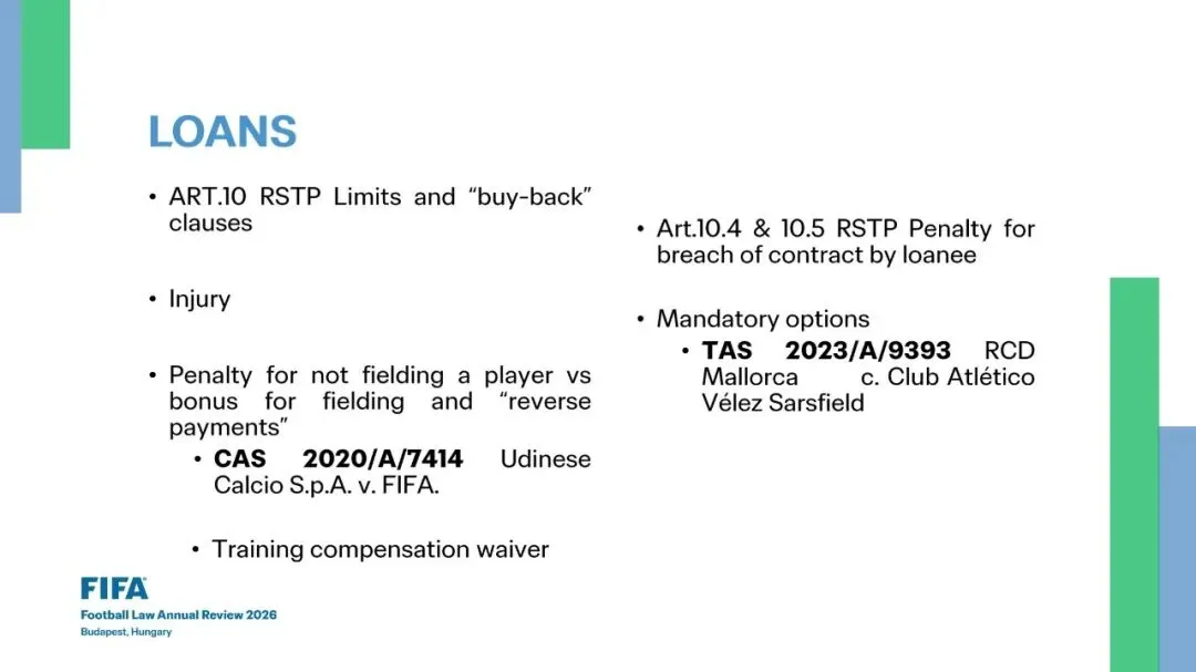 •《规程》(RSTP)第10条: 限制与“回购”(buy-back)条款•未派球员上场的罚款 vs 派球员上场的奖金及“反向付款” (Penalty for not fielding a player vs bonus for fielding and “reverse payments”)•CAS 2020/A/7414 乌迪内斯 (Udinese Calcio S.p.A.) v. 国际足联 (FIFA)•放弃培训补偿金 (Training compensation waiver)•《规程》(RSTP)第10.4条 & 10.5条: 承租方违约的罚款 (Penalty for breach of contract by loanee)•强制买断选择权 (Mandatory options)•TAS 2023/A/9393 皇家马洛卡 (RCD Mallorca) v. 萨斯菲尔德竞技俱乐部 (Club Atlético Vélez Sarsfield)