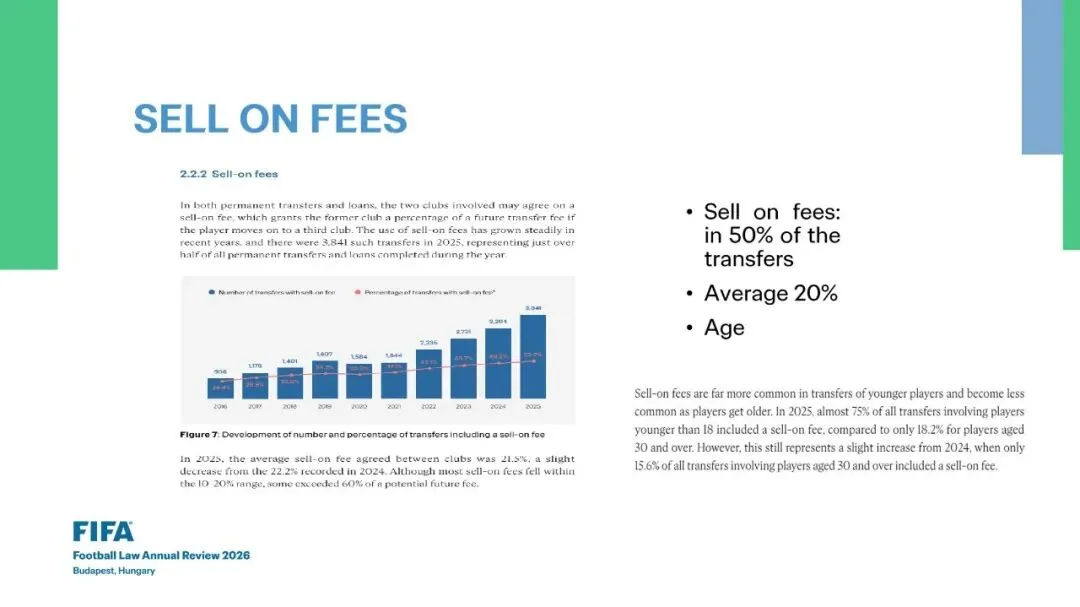 在永久转会和租借中,涉及的两家俱乐部可以就二次转会分成达成协议,即如果球员转会至第三家俱乐部,原俱乐部将获得未来转会费的一定比例。近年来,二次转会分成的使用稳步增长,2025年共有3,841笔此类转会,占当年完成的所有永久转会和租借的一半以上。