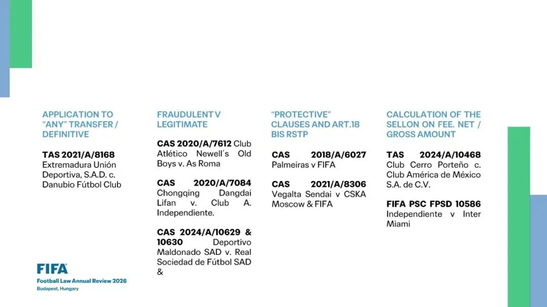 •CAS 2020/A/7612 纽维尔老男孩竞技俱乐部 (Club Atlético Newell´s Old Boys) v. 罗马 (As Roma)•CAS 2020/A/7084 重庆当代力帆 (Chongqing Dangdai Lifan) v. 独立竞技俱乐部 (Club A. Independiente)•CAS 2024/A/10629 & 10630 马尔多纳多体育 (Deportivo Maldonado SAD) v. 皇家社会 (Real Sociedad de Fútbol SAD) & [其他方]“保护性”条款与《规程》(RSTP)第18条之二 (“PROTECTIVE” CLAUSES AND ART.18 BIS RSTP)