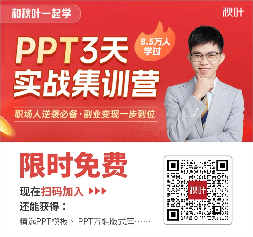 如果你经常为 PPT 排版烦恼,我们为你准备了一份 100 页的 PPT 版式手册,照着抄就能做出高大上的 PPT!现在报名《秋叶 PPT 3 天实战集训营》学习就能获取,还能和专业老师系统学习 PPT 技巧,了解 PPT 接单渠道。赶紧扫描下方二维码加入,和秋叶一起学好 PPT 提效增收吧~ 课程原价 99 元