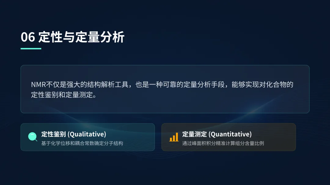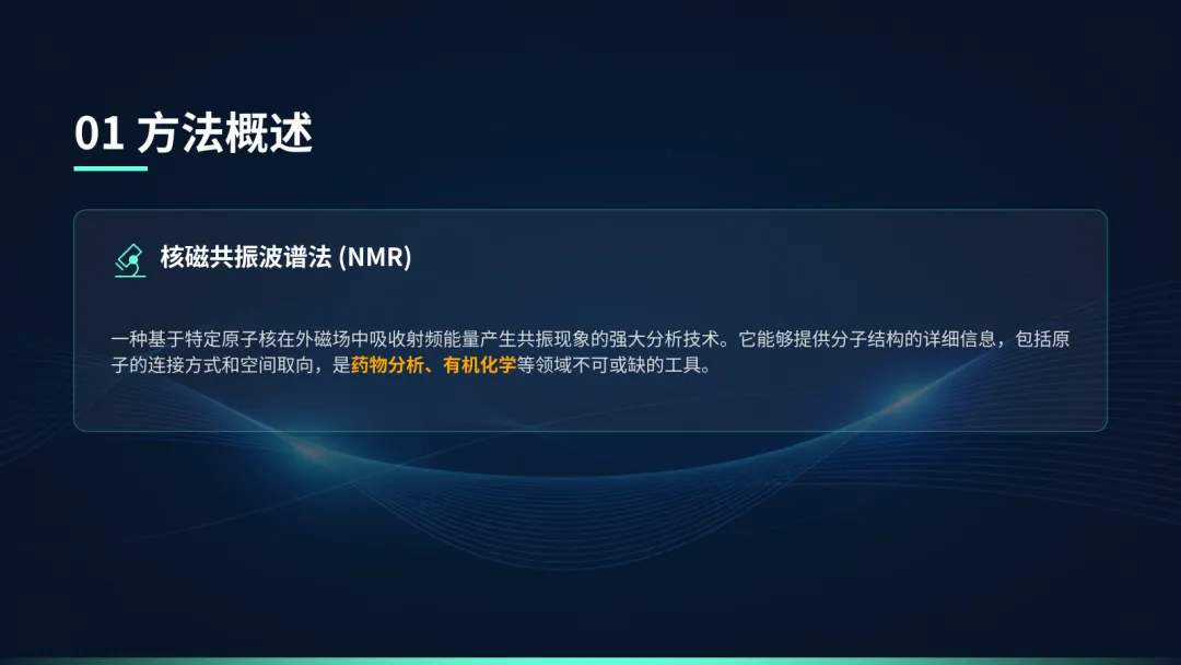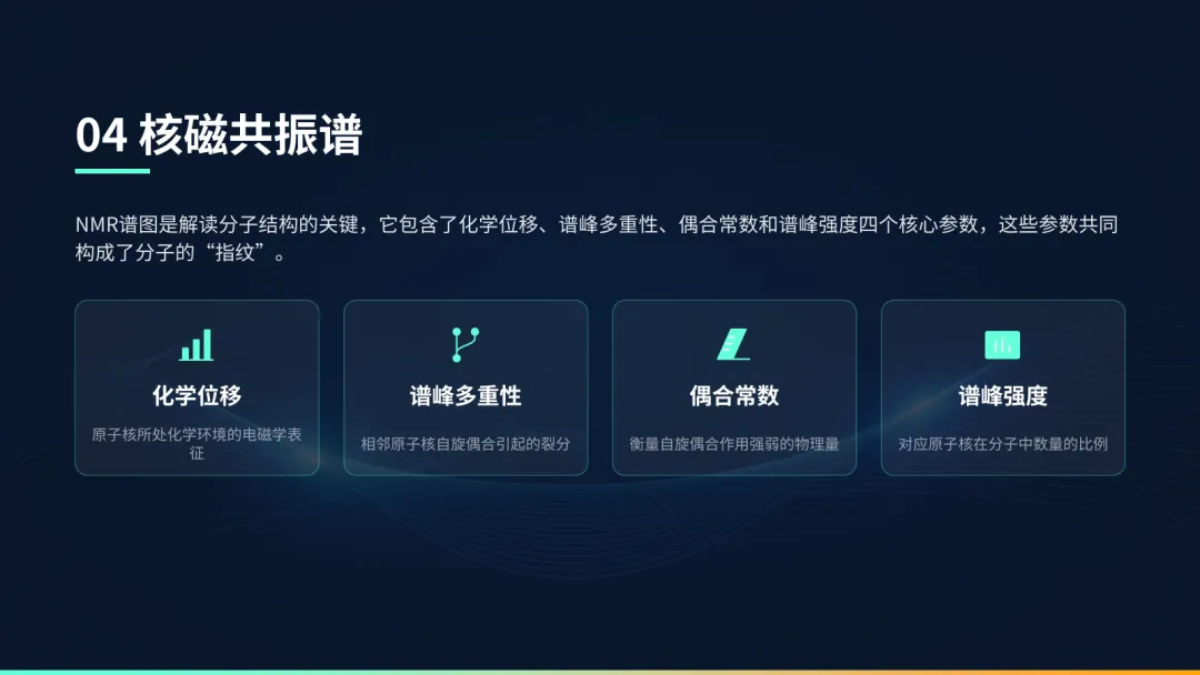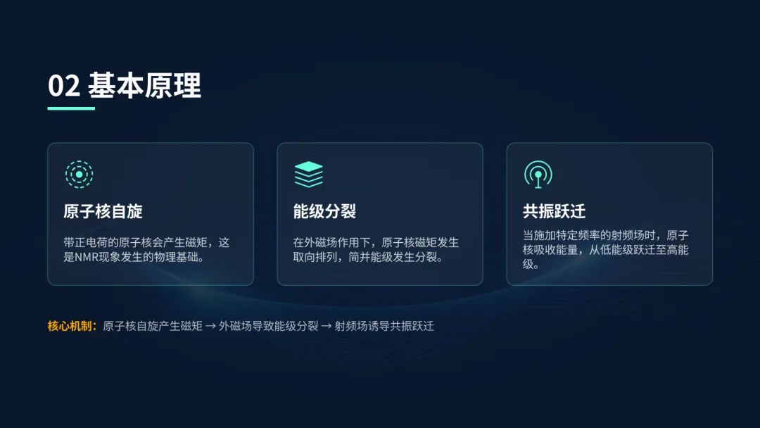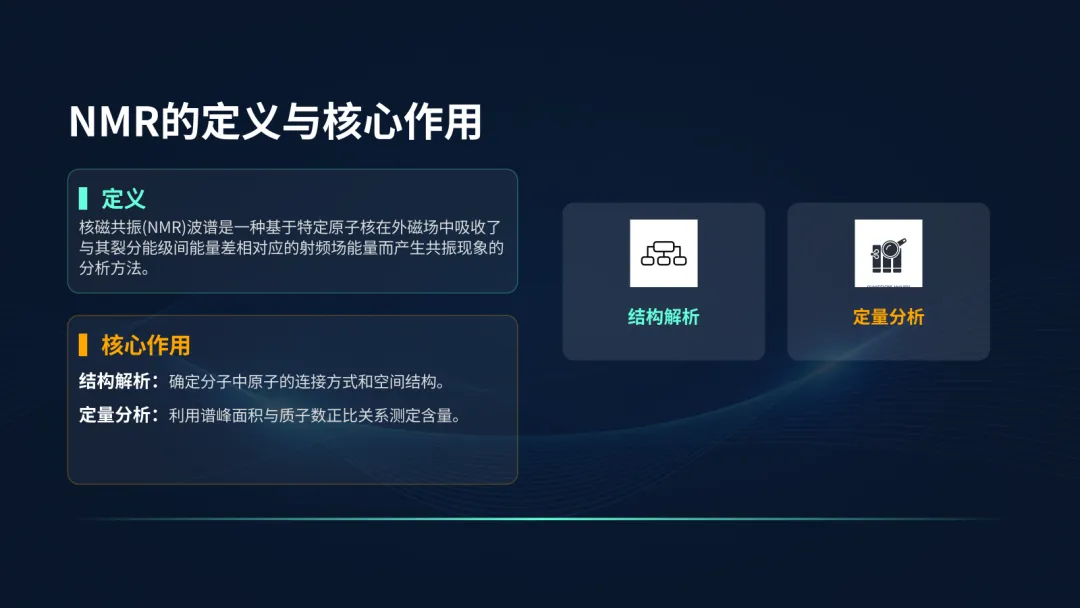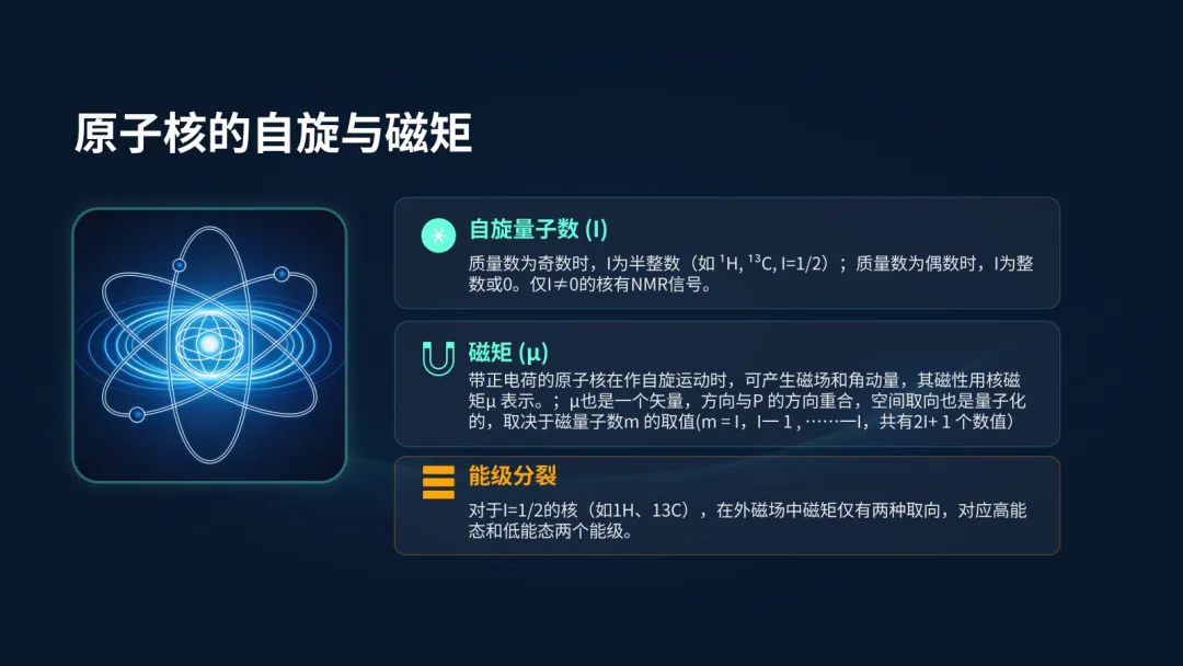如有需要的小伙伴,评论区扣“NMR”免费获取完整PPT哦!核磁共振波谱法,简称NMR,是一种基于原子核物理特性的分析方法。它的核心在于利用特定原子核在磁场中的共振现象,来揭示分子的精细结构信息,是现代科学研究和质量控制中非常重要的手段。NMR的定义是:原子核在外磁场中吸收特定频率的射频辐射,发生能级跃迁的现象。一是结构解析,通过分析谱图上的信号,我们可以像拼拼图一样,还原出分子的精确结构;二是定量分析,因为信号的强度与产生信号的质子数成正比,所以我们可以准确测定样品中各组分的含量。NMR的物理基础是原子核的自旋。